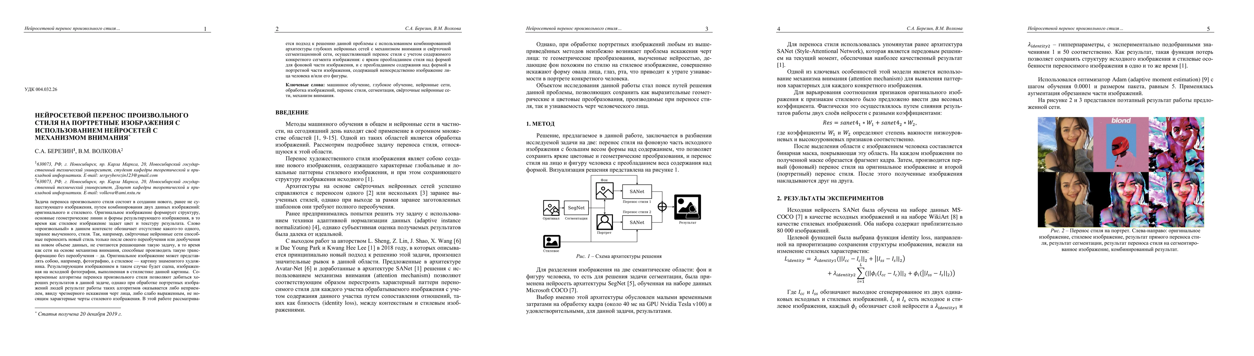 Arbitrary style transfer is the task of synthesis of an image that has never been seen before, using two given images: content image and style image. The content image forms the structure, the basic geometric lines and shapes of the resulting image, while the style image sets the color and texture of the result. The word "arbitrary" in this context means the absence of any one pre-learned style. So, for example, convolutional neural networks capable of transferring a new style only after training or retraining on a new amount of data are not con-sidered to solve such a problem, while networks based on the attention mech-anism that are capable of performing such a transformation without retraining - yes. An original image can be, for example, a photograph, and a style image can be a painting of a famous artist. The resulting image in this case will be the scene depicted in the original photograph, made in the stylie of this picture. Recent arbitrary style transfer algorithms make it possible to achieve good re-sults in this task, however, in processing portrait images of people, the result of such algorithms is either unacceptable due to excessive distortion of facial features, or weakly expressed, not bearing the characteristic features of a style image. In this paper, we consider an approach to solving this problem using the combined architecture of deep neural networks with a attention mechanism that transfers style based on the contents of a particular image segment: with a clear predominance of style over the form for the background part of the im-age, and with the prevalence of content over the form in the image part con-taining directly the image of a person.