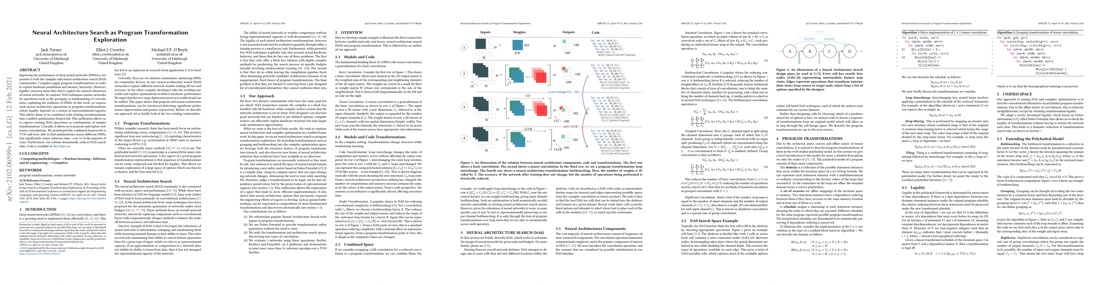 This paper proposes expressing neural architecture search (NAS) operations as program transformations, enabling their combination with existing compiler optimizations. The approach significantly reduces inference time and NAS search time, demonstrated through a prototype in TVM.