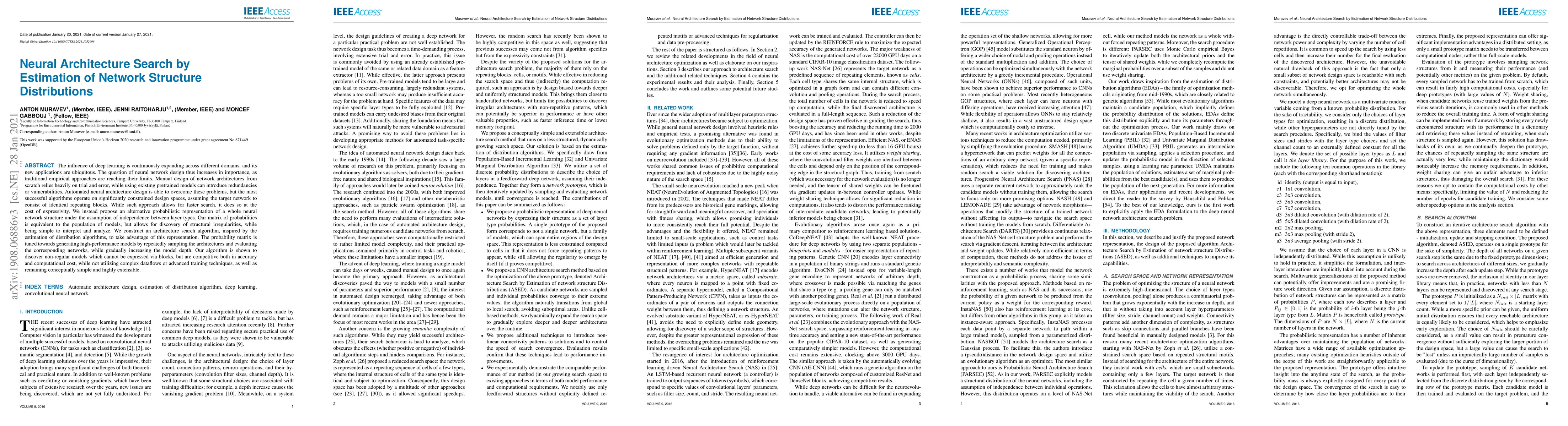 The influence of deep learning is continuously expanding across different domains, and its new applications are ubiquitous. The question of neural network design thus increases in importance, as traditional empirical approaches are reaching their limits. Manual design of network architectures from scratch relies heavily on trial and error, while using existing pretrained models can introduce redundancies or vulnerabilities. Automated neural architecture design is able to overcome these problems, but the most successful algorithms operate on significantly constrained design spaces, assuming the target network to consist of identical repeating blocks. While such approach allows for faster search, it does so at the cost of expressivity. We instead propose an alternative probabilistic representation of a whole neural network structure under the assumption of independence between layer types. Our matrix of probabilities is equivalent to the population of models, but allows for discovery of structural irregularities, while being simple to interpret and analyze. We construct an architecture search algorithm, inspired by the estimation of distribution algorithms, to take advantage of this representation. The probability matrix is tuned towards generating high-performance models by repeatedly sampling the architectures and evaluating the corresponding networks, while gradually increasing the model depth. Our algorithm is shown to discover non-regular models which cannot be expressed via blocks, but are competitive both in accuracy and computational cost, while not utilizing complex dataflows or advanced training techniques, as well as remaining conceptually simple and highly extensible.