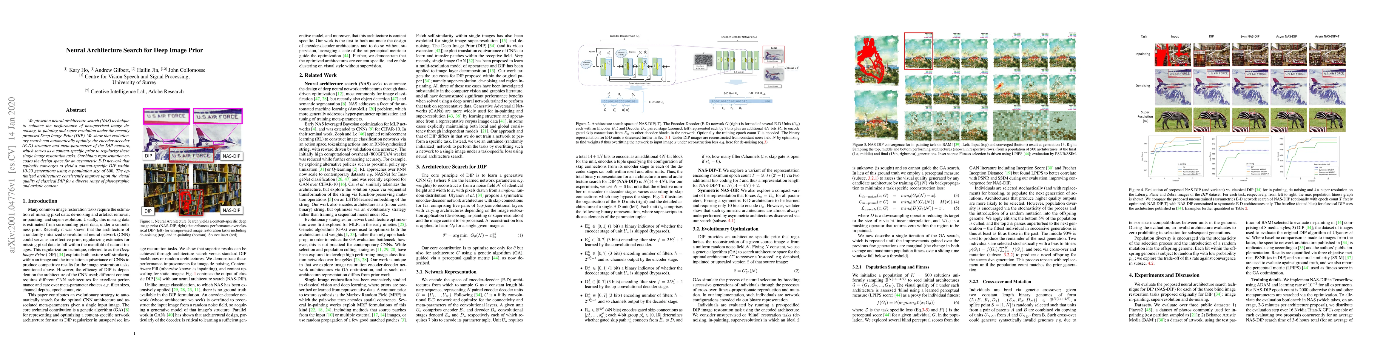 The paper introduces a Neural Architecture Search (NAS) method to improve unsupervised image restoration tasks like de-noising, in-painting, and super-resolution using Deep Image Prior (DIP). This method uses evolutionary search to optimize the encoder-decoder structure and meta-parameters of DIP, leading to content-specific prior regularization. The optimized architectures show better visual quality than classical DIP for various image types within 10-20 generations using a population size of 500.
