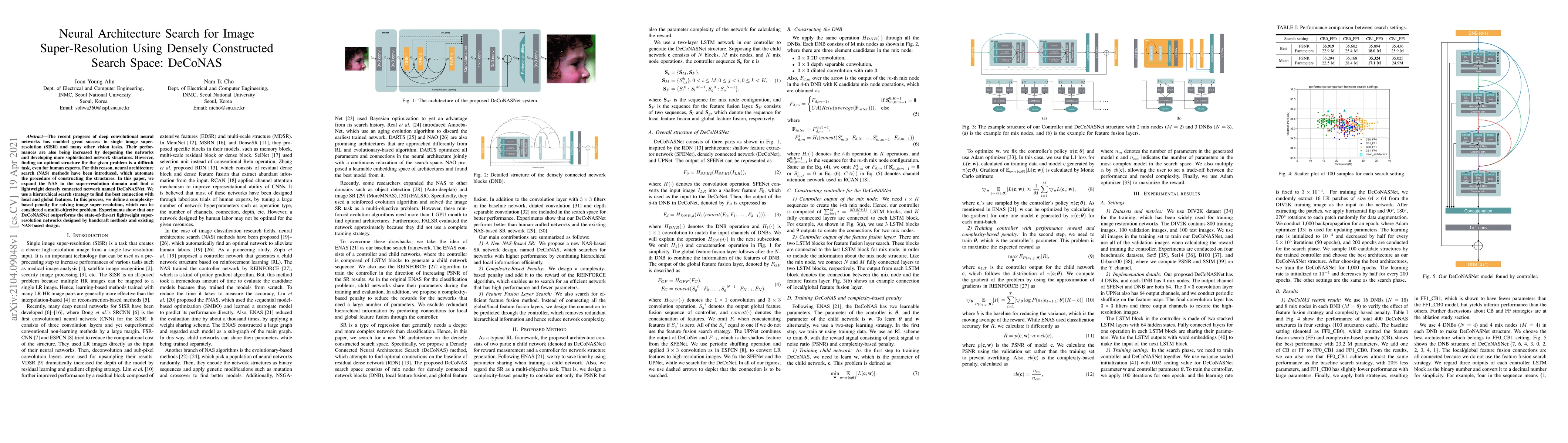 This paper proposes DeCoNAS, a neural architecture search method for optimizing densely connected networks for image super-resolution. Using a hierarchical search strategy, it defines a complexity-based penalty to balance performance and efficiency, resulting in a lightweight network that outperforms existing methods.