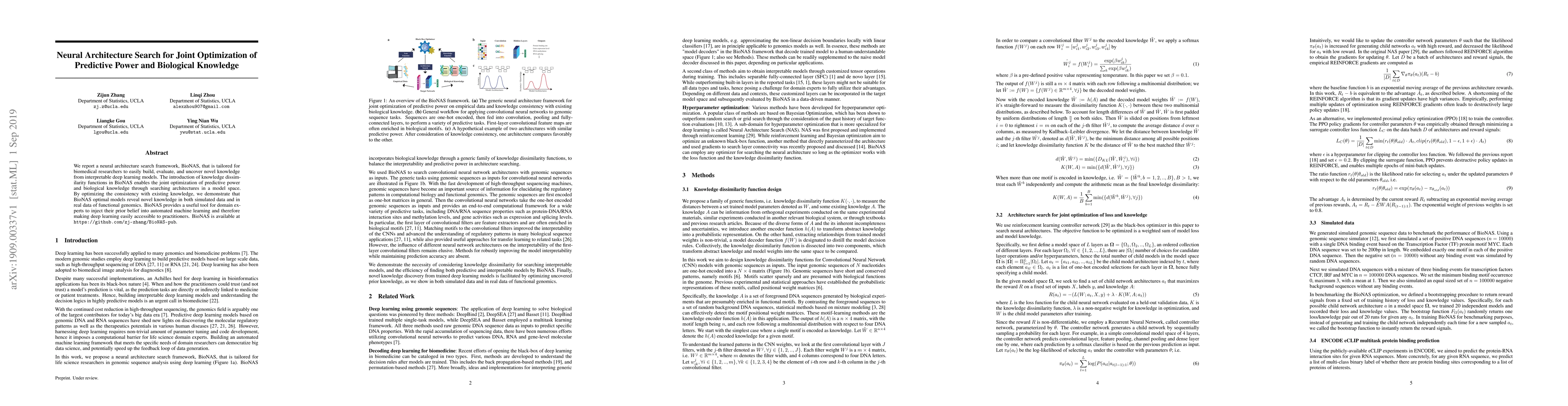 We report a neural architecture search framework, BioNAS, that is tailored for biomedical researchers to easily build, evaluate, and uncover novel knowledge from interpretable deep learning models. The introduction of knowledge dissimilarity functions in BioNAS enables the joint optimization of predictive power and biological knowledge through searching architectures in a model space. By optimizing the consistency with existing knowledge, we demonstrate that BioNAS optimal models reveal novel knowledge in both simulated data and in real data of functional genomics. BioNAS provides a useful tool for domain experts to inject their prior belief into automated machine learning and therefore making deep learning easily accessible to practitioners. BioNAS is available at https://github.com/zj-zhang/BioNAS-pub.