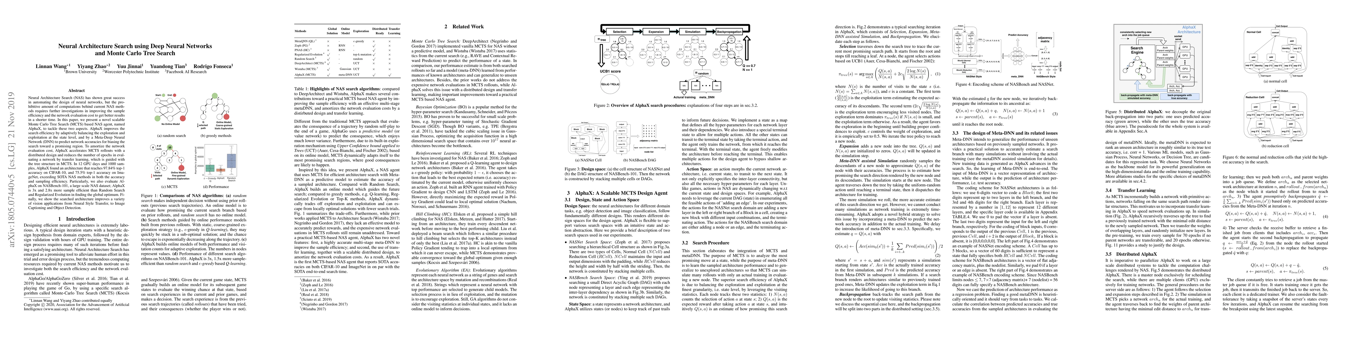 This paper introduces AlphaX, a scalable Monte Carlo Tree Search (MCTS) based Neural Architecture Search (NAS) agent that enhances search efficiency and reduces network evaluation costs. AlphaX achieves superior accuracy on CIFAR-10 and ImageNet, and demonstrates significant sample efficiency improvements over existing methods on NASBench-101.