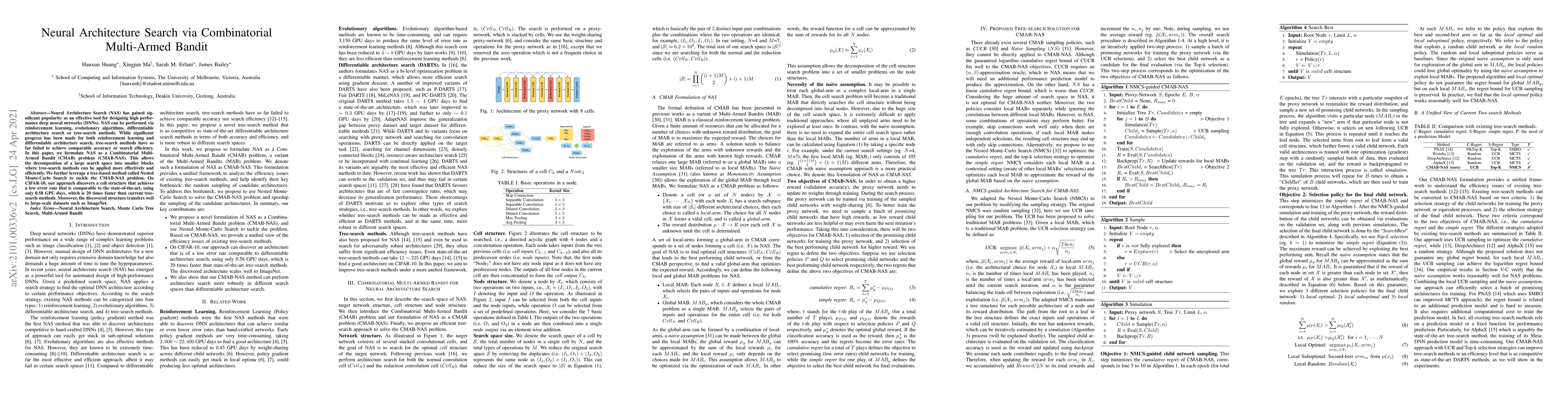 This paper proposes a novel approach to Neural Architecture Search (NAS) by formulating it as a Combinatorial Multi-Armed Bandit (CMAB) problem, enabling efficient tree-search methods. The method discovers competitive neural network architectures significantly faster than existing tree-search methods, achieving state-of-the-art performance on CIFAR-10 and transferring well to ImageNet.