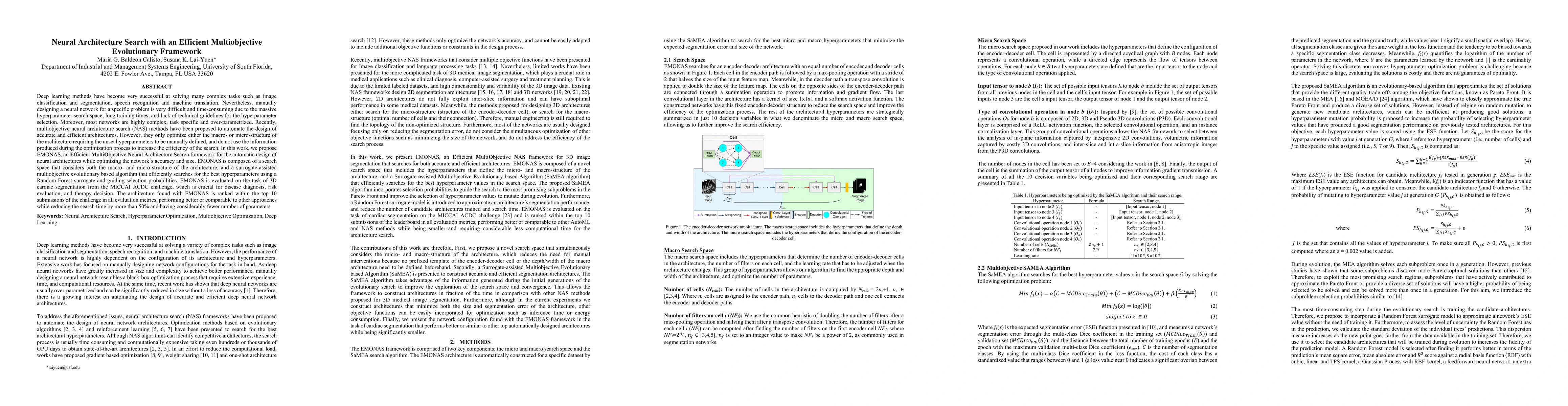 This paper introduces EMONAS, an efficient multiobjective evolutionary framework for automating the design of neural architectures by optimizing both accuracy and size. The proposed method leverages a surrogate-assisted evolutionary algorithm and outperforms other approaches on a 3D cardiac segmentation task, reducing search time by over 50% and achieving fewer parameters.