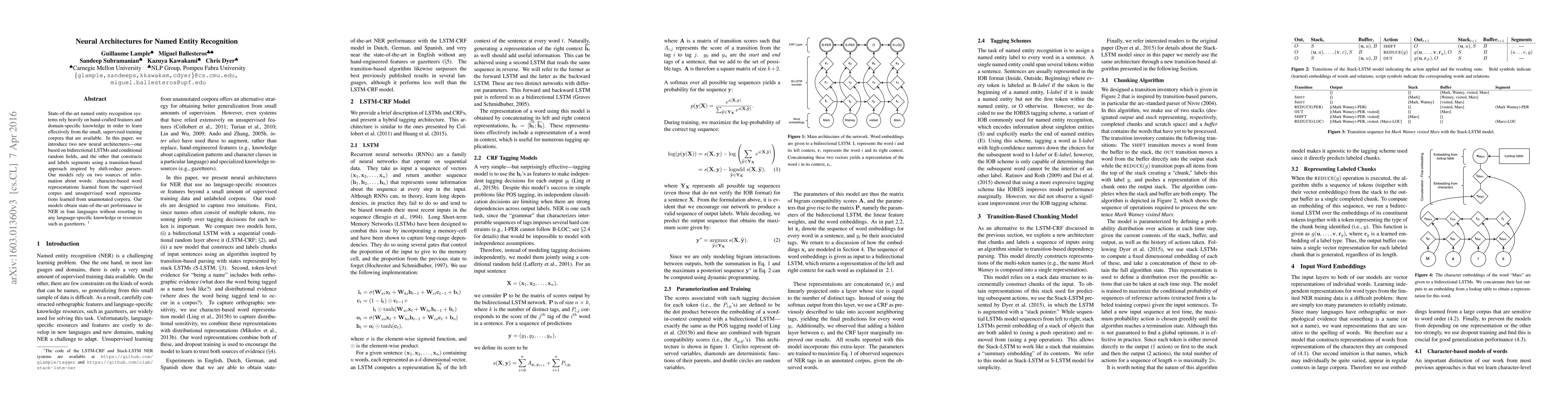 This paper proposes two advanced neural architectures for named entity recognition (NER) that outperform traditional methods by leveraging character-based and unsupervised word representations, achieving state-of-the-art results across four languages without relying on language-specific resources.