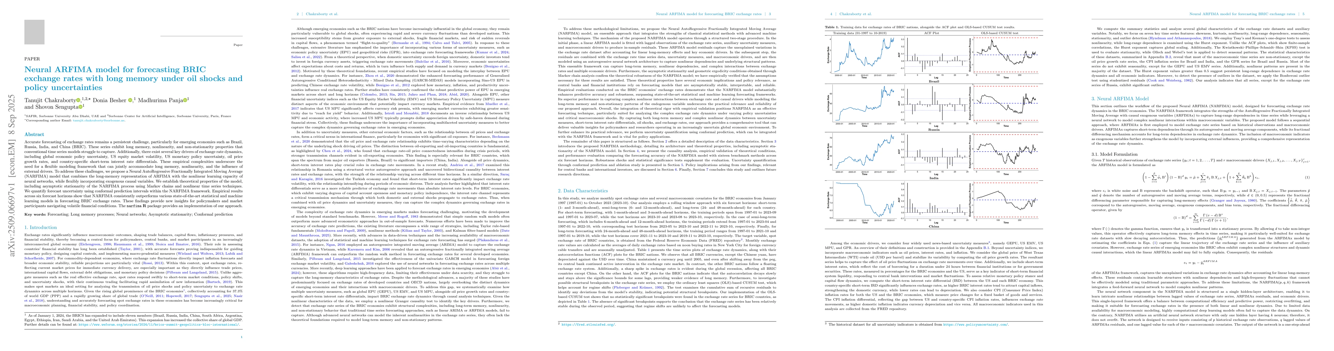 Accurate forecasting of exchange rates remains a persistent challenge, particularly for emerging economies such as Brazil, Russia, India, and China (BRIC). These series exhibit long memory, nonlinearity, and non-stationarity properties that conventional time series models struggle to capture. Additionally, there exist several key drivers of exchange rate dynamics, including global economic policy uncertainty, US equity market volatility, US monetary policy uncertainty, oil price growth rates, and country-specific short-term interest rate differentials. These empirical complexities underscore the need for a flexible modeling framework that can jointly accommodate long memory, nonlinearity, and the influence of external drivers. To address these challenges, we propose a Neural AutoRegressive Fractionally Integrated Moving Average (NARFIMA) model that combines the long-memory representation of ARFIMA with the nonlinear learning capacity of neural networks, while flexibly incorporating exogenous causal variables. We establish theoretical properties of the model, including asymptotic stationarity of the NARFIMA process using Markov chains and nonlinear time series techniques. We quantify forecast uncertainty using conformal prediction intervals within the NARFIMA framework. Empirical results across six forecast horizons show that NARFIMA consistently outperforms various state-of-the-art statistical and machine learning models in forecasting BRIC exchange rates. These findings provide new insights for policymakers and market participants navigating volatile financial conditions. The \texttt{narfima} \textbf{R} package provides an implementation of our approach.