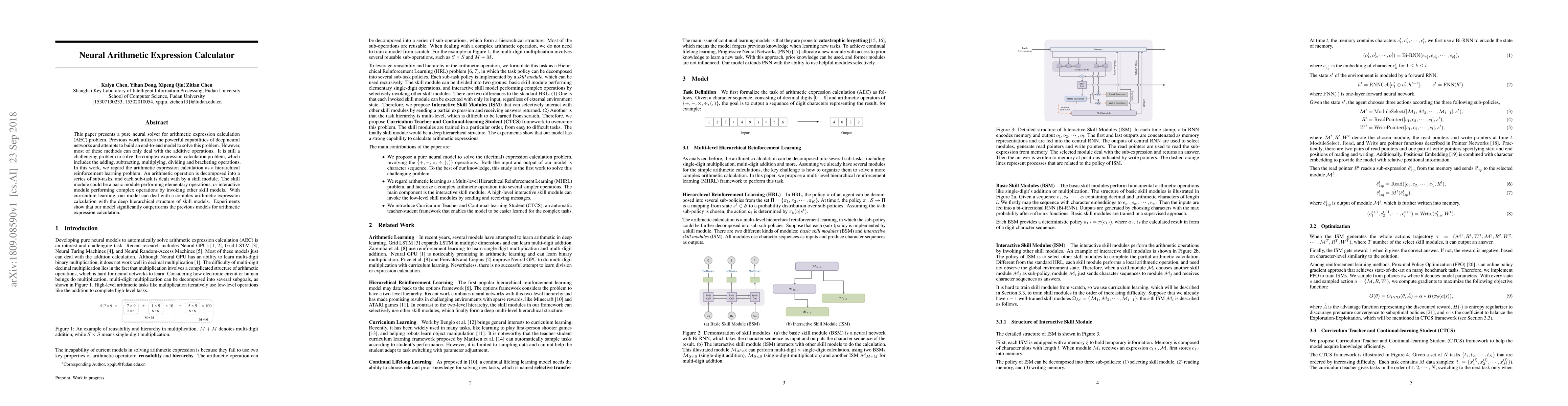 This paper introduces a neural solver for complex arithmetic expression calculation, addressing both basic and complex operations through a hierarchical reinforcement learning approach with skill modules. The model outperforms previous methods, demonstrating superior performance in handling intricate expressions.