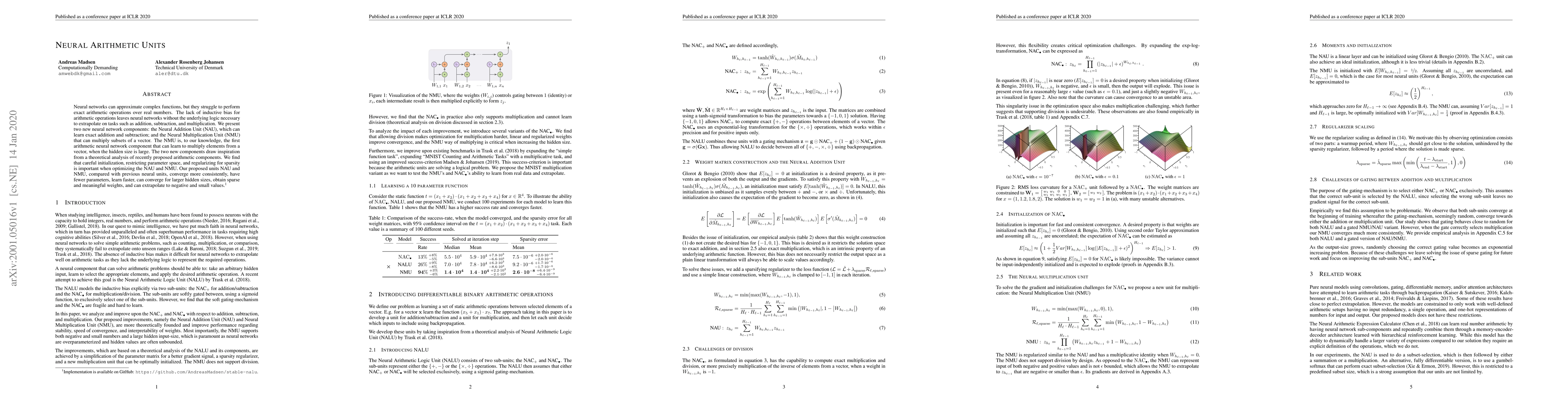 This paper introduces two new neural network components, the Neural Addition Unit (NAU) and the Neural Multiplication Unit (NMU), designed to perform exact arithmetic operations. These units converge more consistently, require fewer parameters, and learn faster compared to previous neural units, achieving better performance on tasks involving addition, subtraction, and multiplication.