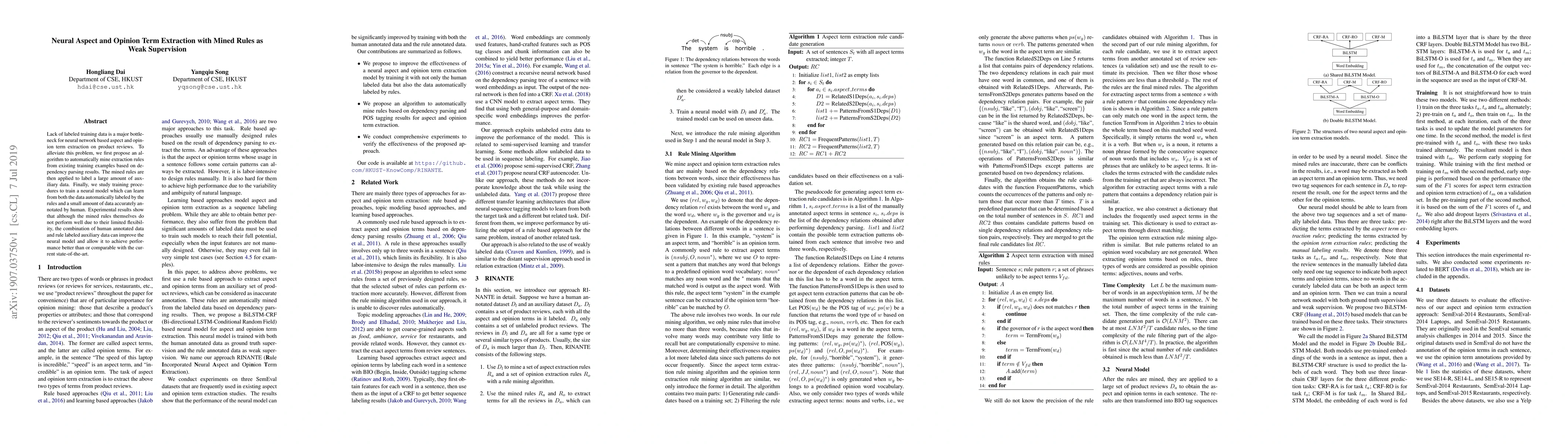 This paper proposes an algorithm to mine extraction rules from existing training examples to label auxiliary data, which is then used to train a neural model for aspect and opinion term extraction. The combination of human-annotated data and rule-labeled data improves the model's performance, achieving results comparable to state-of-the-art methods despite the limitations of the mined rules.