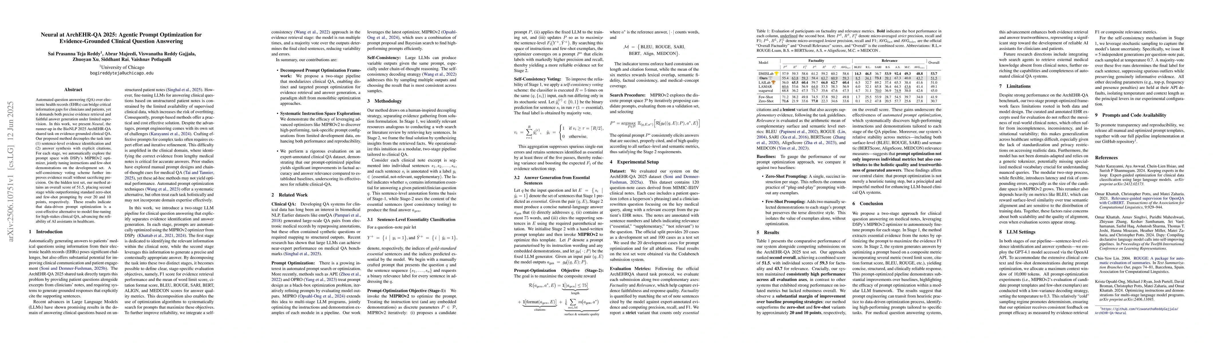 Automated question answering (QA) over electronic health records (EHRs) can bridge critical information gaps for clinicians and patients, yet it demands both precise evidence retrieval and faithful answer generation under limited supervision. In this work, we present Neural, the runner-up in the BioNLP 2025 ArchEHR-QA shared task on evidence-grounded clinical QA. Our proposed method decouples the task into (1) sentence-level evidence identification and (2) answer synthesis with explicit citations. For each stage, we automatically explore the prompt space with DSPy's MIPROv2 optimizer, jointly tuning instructions and few-shot demonstrations on the development set. A self-consistency voting scheme further improves evidence recall without sacrificing precision. On the hidden test set, our method attains an overall score of 51.5, placing second stage while outperforming standard zero-shot and few-shot prompting by over 20 and 10 points, respectively. These results indicate that data-driven prompt optimization is a cost-effective alternative to model fine-tuning for high-stakes clinical QA, advancing the reliability of AI assistants in healthcare.