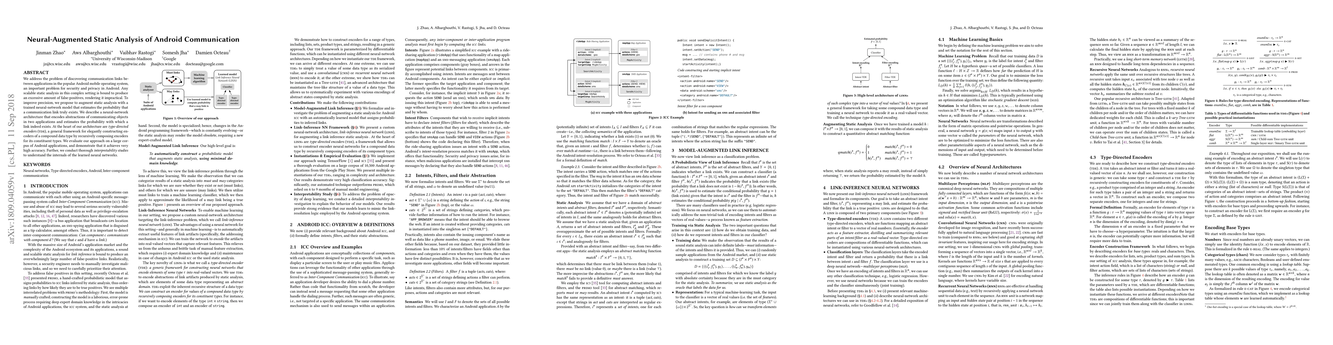 We address the problem of discovering communication links between applications in the popular Android mobile operating system, an important problem for security and privacy in Android. Any scalable static analysis in this complex setting is bound to produce an excessive amount of false-positives, rendering it impractical. To improve precision, we propose to augment static analysis with a trained neural-network model that estimates the probability that a communication link truly exists. We describe a neural-network architecture that encodes abstractions of communicating objects in two applications and estimates the probability with which a link indeed exists. At the heart of our architecture are type-directed encoders (TDE), a general framework for elegantly constructing encoders of a compound data type by recursively composing encoders for its constituent types. We evaluate our approach on a large corpus of Android applications, and demonstrate that it achieves very high accuracy. Further, we conduct thorough interpretability studies to understand the internals of the learned neural networks.