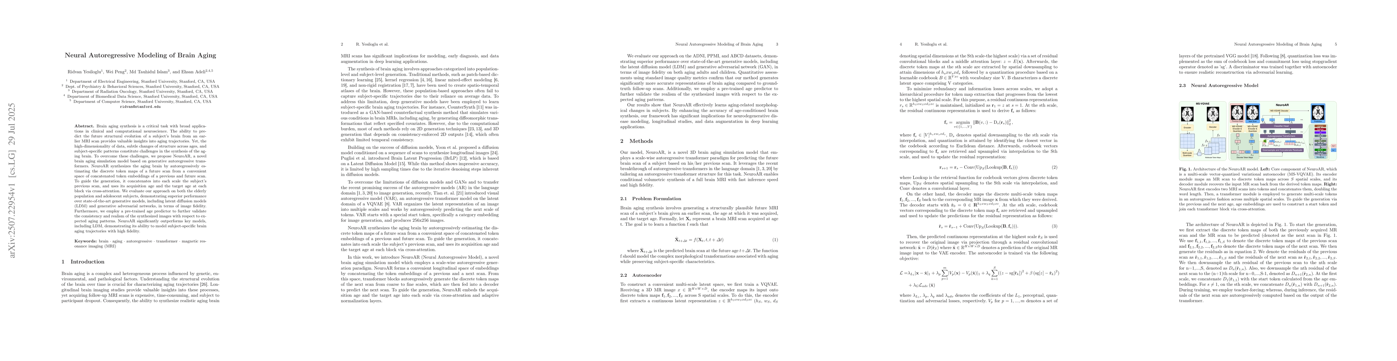 Brain aging synthesis is a critical task with broad applications in clinical and computational neuroscience. The ability to predict the future structural evolution of a subject's brain from an earlier MRI scan provides valuable insights into aging trajectories. Yet, the high-dimensionality of data, subtle changes of structure across ages, and subject-specific patterns constitute challenges in the synthesis of the aging brain. To overcome these challenges, we propose NeuroAR, a novel brain aging simulation model based on generative autoregressive transformers. NeuroAR synthesizes the aging brain by autoregressively estimating the discrete token maps of a future scan from a convenient space of concatenated token embeddings of a previous and future scan. To guide the generation, it concatenates into each scale the subject's previous scan, and uses its acquisition age and the target age at each block via cross-attention. We evaluate our approach on both the elderly population and adolescent subjects, demonstrating superior performance over state-of-the-art generative models, including latent diffusion models (LDM) and generative adversarial networks, in terms of image fidelity. Furthermore, we employ a pre-trained age predictor to further validate the consistency and realism of the synthesized images with respect to expected aging patterns. NeuroAR significantly outperforms key models, including LDM, demonstrating its ability to model subject-specific brain aging trajectories with high fidelity.