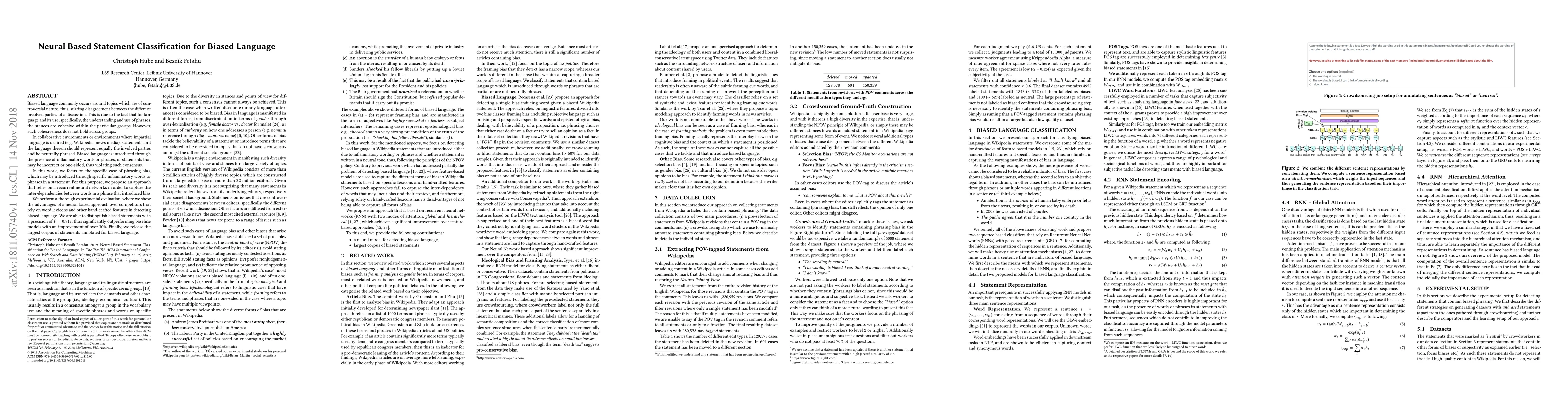 This paper proposes a neural network approach to classify biased language in statements, using recurrent neural networks to capture word inter-dependencies. Experimental results show a 30% improvement over baseline models, achieving a precision of 0.92 in detecting biased language.
