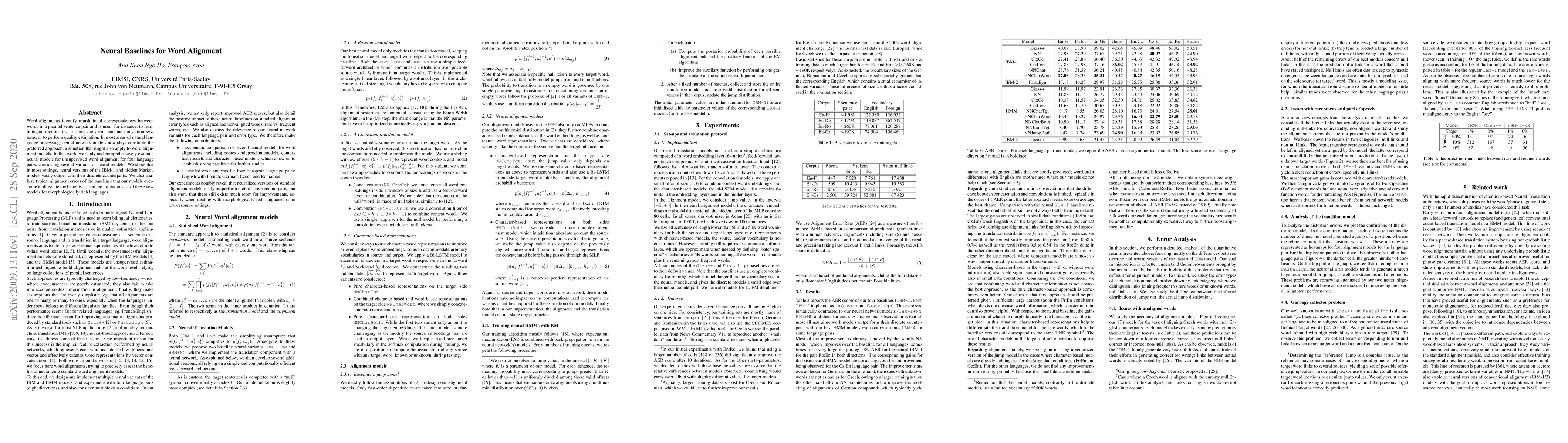 This research explores neural baselines for unsupervised word alignment, evaluating several neural model variants for four language pairs. Neural versions of IBM-1 and hidden Markov models significantly outperform traditional discrete models, highlighting benefits and limitations for morphologically rich languages.
