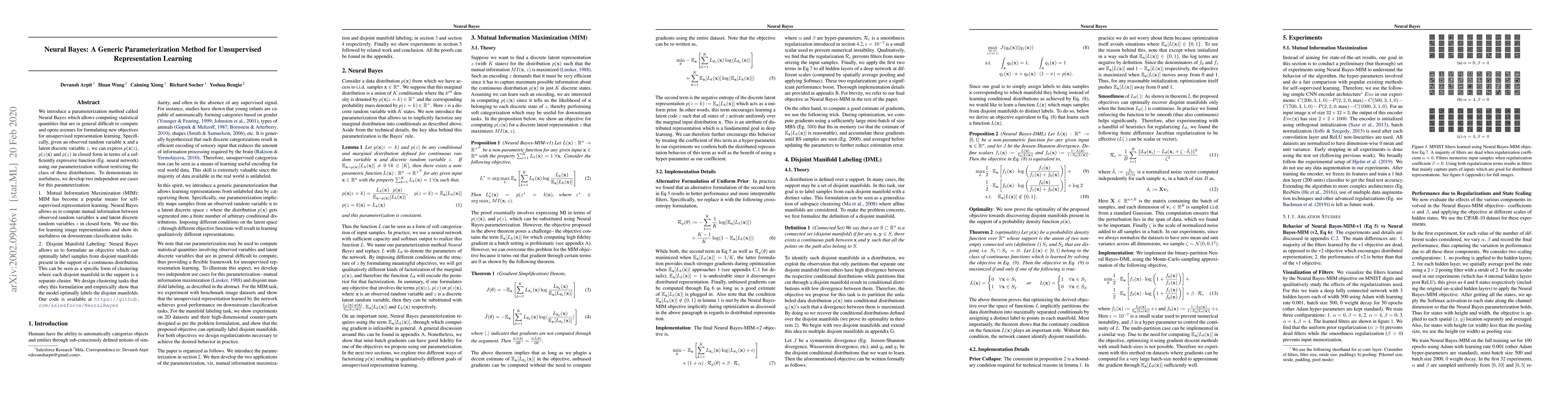 Neural Bayes introduces a flexible parameterization method for unsupervised representation learning, enabling closed-form computation of statistical quantities. It demonstrates effectiveness in mutual information maximization for image representation and in disjoint manifold labeling for clustering tasks.