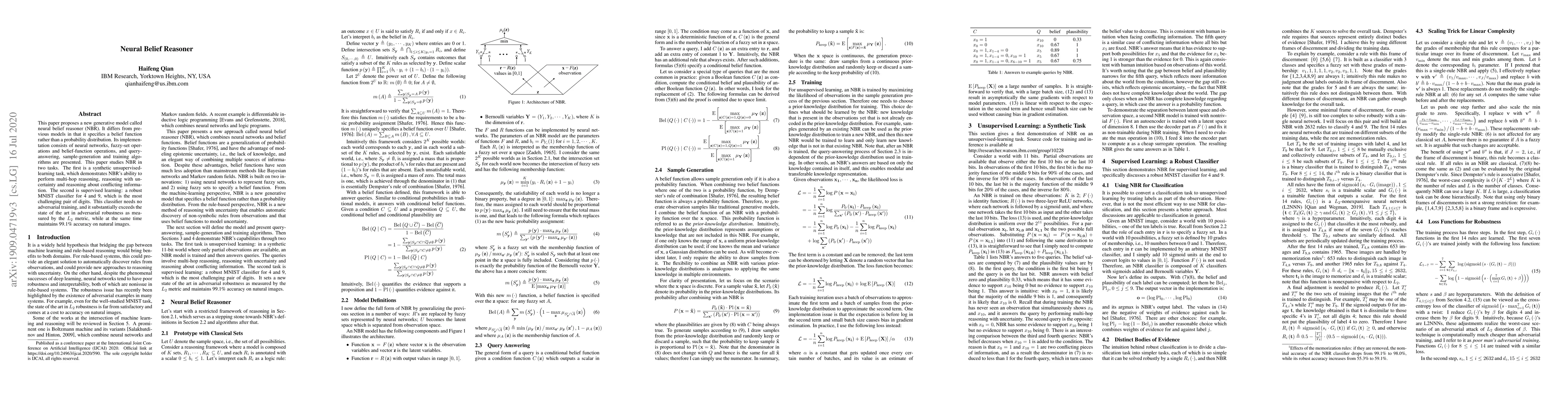 The paper introduces the Neural Belief Reasoner (NBR), a generative model utilizing belief functions instead of probability distributions, implemented with neural networks and fuzzy-set operations. It demonstrates NBR's effectiveness in multi-hop reasoning and uncertainty handling in an unsupervised task, and its superior adversarial robustness in a supervised MNIST classifier for challenging digits.