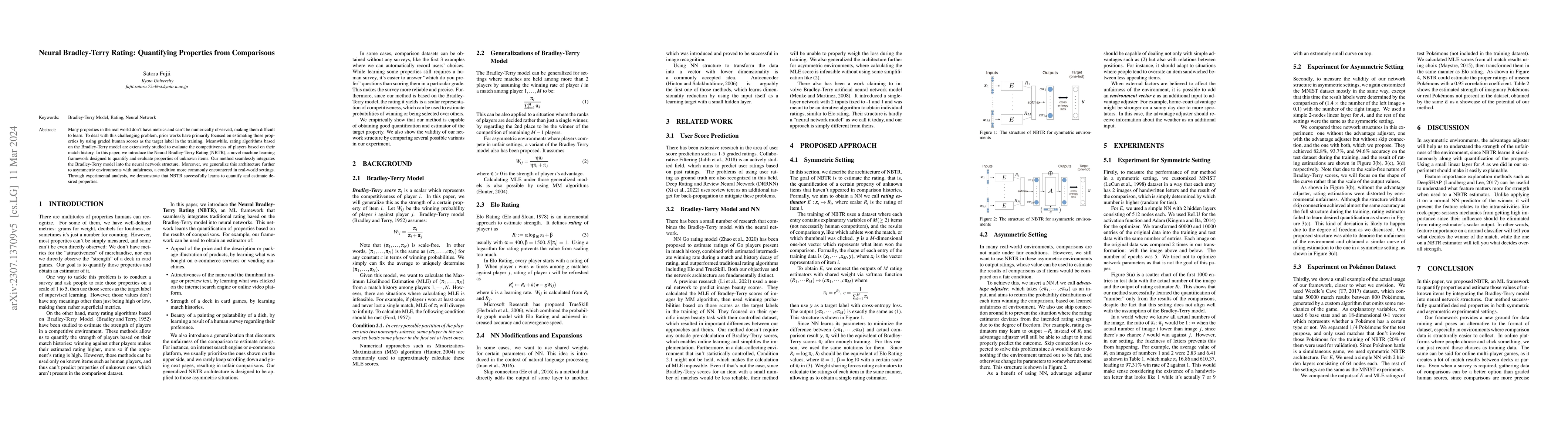 This paper introduces the Neural Bradley-Terry Rating (NBTR), a novel framework that integrates the Bradley-Terry model into neural networks to quantify properties of unknown items from comparison-based data. The method is shown to effectively generalize to asymmetric environments with unfairness and demonstrates successful property estimation through experiments.