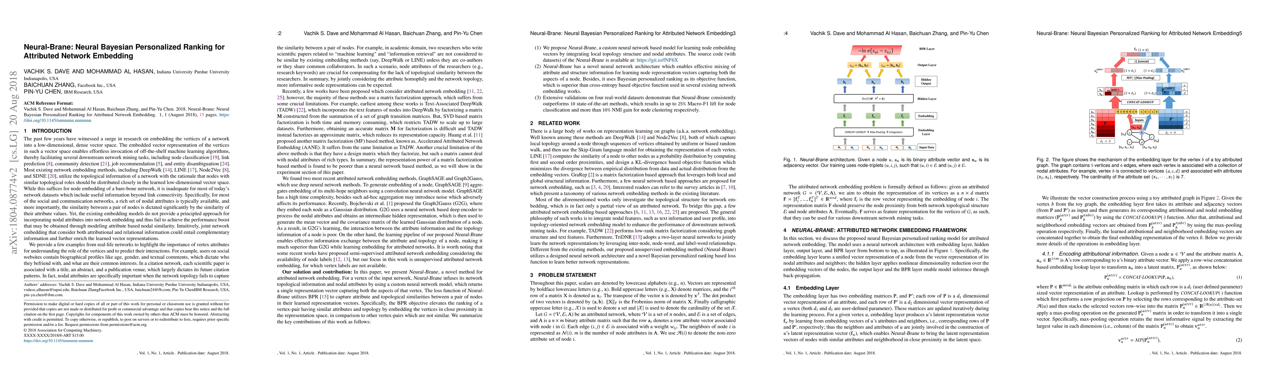 Neural-Brane integrates neural networks and Bayesian Personalized Ranking to embed vertices in attributed networks, combining both topological and nodal attribute information for richer representations. The method outperforms existing techniques in node classification and clustering tasks on real-world datasets.