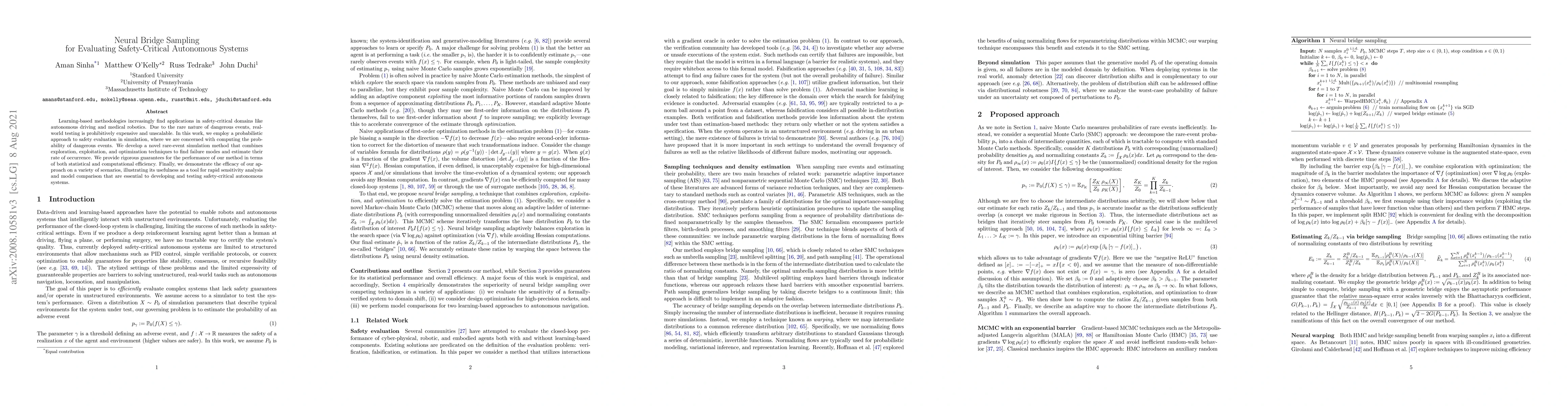 This paper introduces a probabilistic approach for evaluating safety-critical autonomous systems through simulation, employing a novel rare-event sampling method to estimate dangerous event probabilities. The method combines exploration, exploitation, and optimization to identify failure modes efficiently, providing rigorous statistical and computational guarantees.