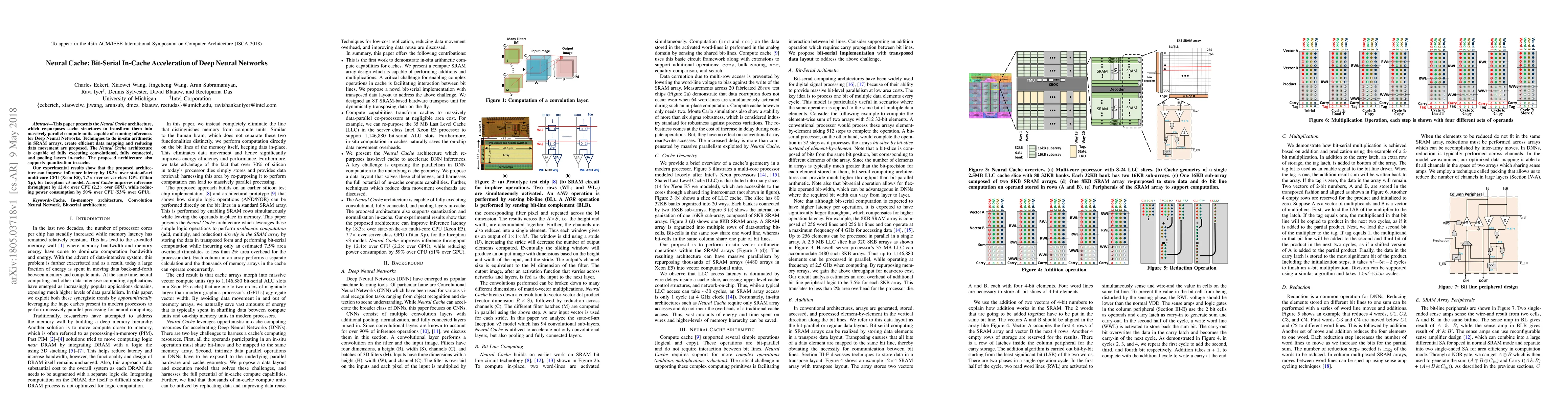 This paper presents the Neural Cache architecture, which re-purposes cache structures to transform them into massively parallel compute units capable of running inferences for Deep Neural Networks. Techniques to do in-situ arithmetic in SRAM arrays, create efficient data mapping and reducing data movement are proposed. The Neural Cache architecture is capable of fully executing convolutional, fully connected, and pooling layers in-cache. The proposed architecture also supports quantization in-cache. Our experimental results show that the proposed architecture can improve inference latency by 18.3x over state-of-art multi-core CPU (Xeon E5), 7.7x over server class GPU (Titan Xp), for Inception v3 model. Neural Cache improves inference throughput by 12.4x over CPU (2.2x over GPU), while reducing power consumption by 50% over CPU (53% over GPU).