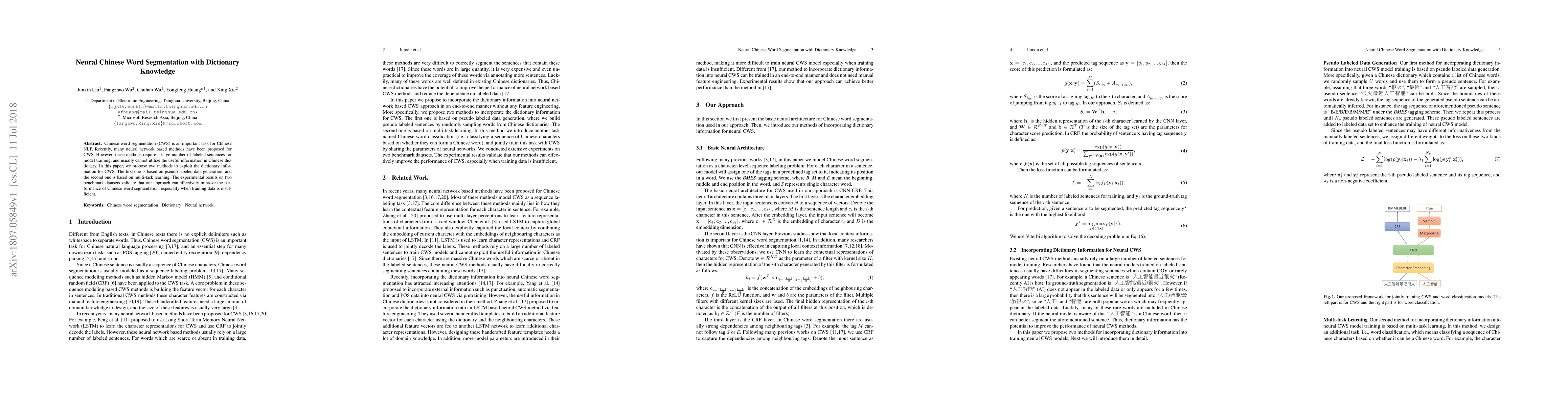This paper proposes two neural network methods for Chinese word segmentation that leverage dictionary knowledge: one using pseudo labeled data and the other through multi-task learning. Experimental results show that these approaches significantly enhance segmentation performance, particularly when limited training data is available.
