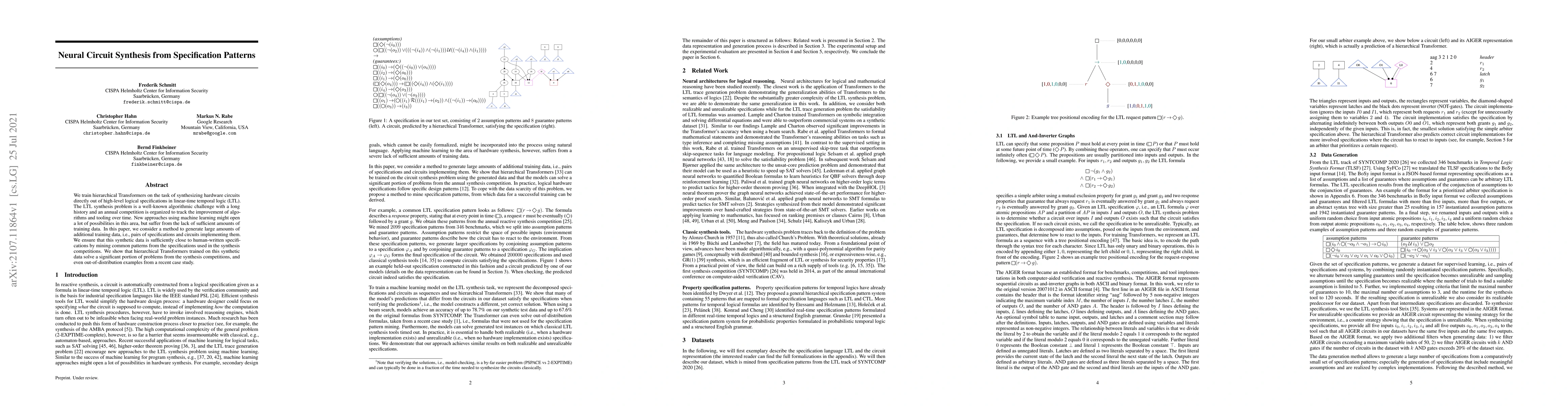 We train hierarchical Transformers on the task of synthesizing hardware circuits directly out of high-level logical specifications in linear-time temporal logic (LTL). The LTL synthesis problem is a well-known algorithmic challenge with a long history and an annual competition is organized to track the improvement of algorithms and tooling over time. New approaches using machine learning might open a lot of possibilities in this area, but suffer from the lack of sufficient amounts of training data. In this paper, we consider a method to generate large amounts of additional training data, i.e., pairs of specifications and circuits implementing them. We ensure that this synthetic data is sufficiently close to human-written specifications by mining common patterns from the specifications used in the synthesis competitions. We show that hierarchical Transformers trained on this synthetic data solve a significant portion of problems from the synthesis competitions, and even out-of-distribution examples from a recent case study.