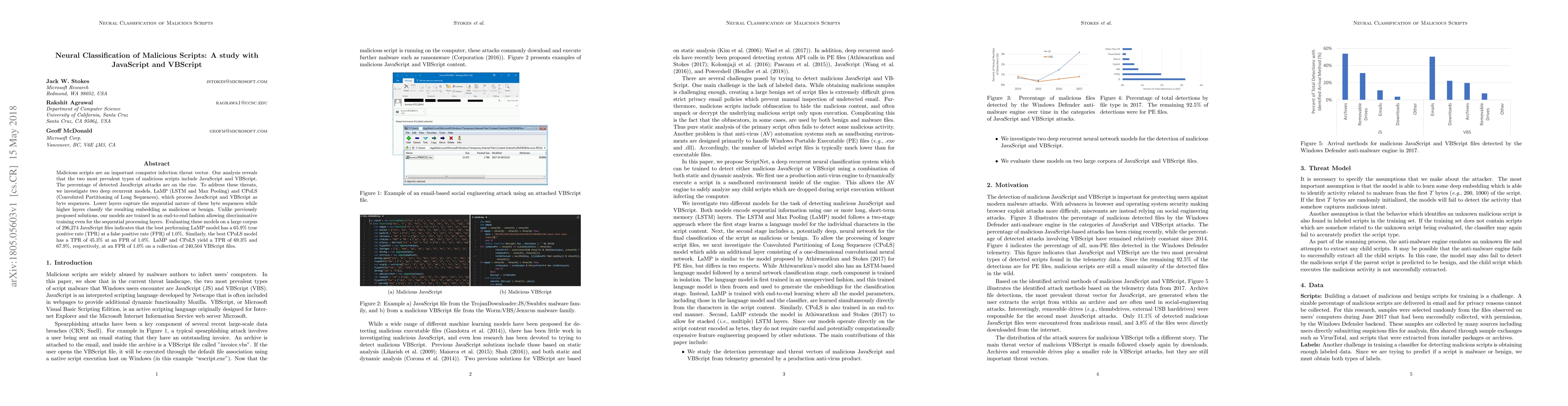 Malicious scripts are an important computer infection threat vector. Our analysis reveals that the two most prevalent types of malicious scripts include JavaScript and VBScript. The percentage of detected JavaScript attacks are on the rise. To address these threats, we investigate two deep recurrent models, LaMP (LSTM and Max Pooling) and CPoLS (Convoluted Partitioning of Long Sequences), which process JavaScript and VBScript as byte sequences. Lower layers capture the sequential nature of these byte sequences while higher layers classify the resulting embedding as malicious or benign. Unlike previously proposed solutions, our models are trained in an end-to-end fashion allowing discriminative training even for the sequential processing layers. Evaluating these models on a large corpus of 296,274 JavaScript files indicates that the best performing LaMP model has a 65.9% true positive rate (TPR) at a false positive rate (FPR) of 1.0%. Similarly, the best CPoLS model has a TPR of 45.3% at an FPR of 1.0%. LaMP and CPoLS yield a TPR of 69.3% and 67.9%, respectively, at an FPR of 1.0% on a collection of 240,504 VBScript files.