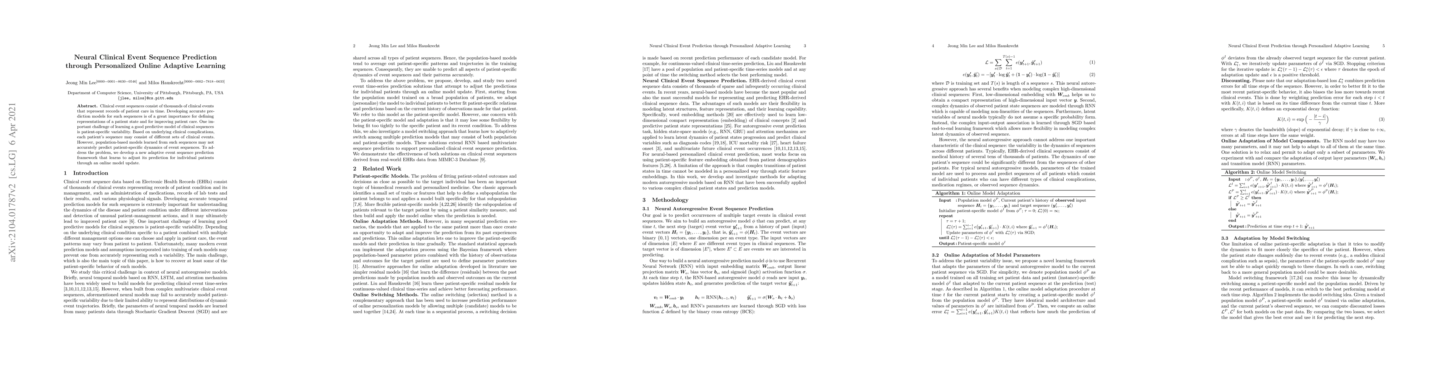 This paper introduces a new adaptive framework for predicting personalized clinical event sequences using online learning to adjust models for individual patients, addressing the challenge of patient-specific variability in clinical data. The method aims to enhance patient care by providing more accurate predictions of unique event sequences.
