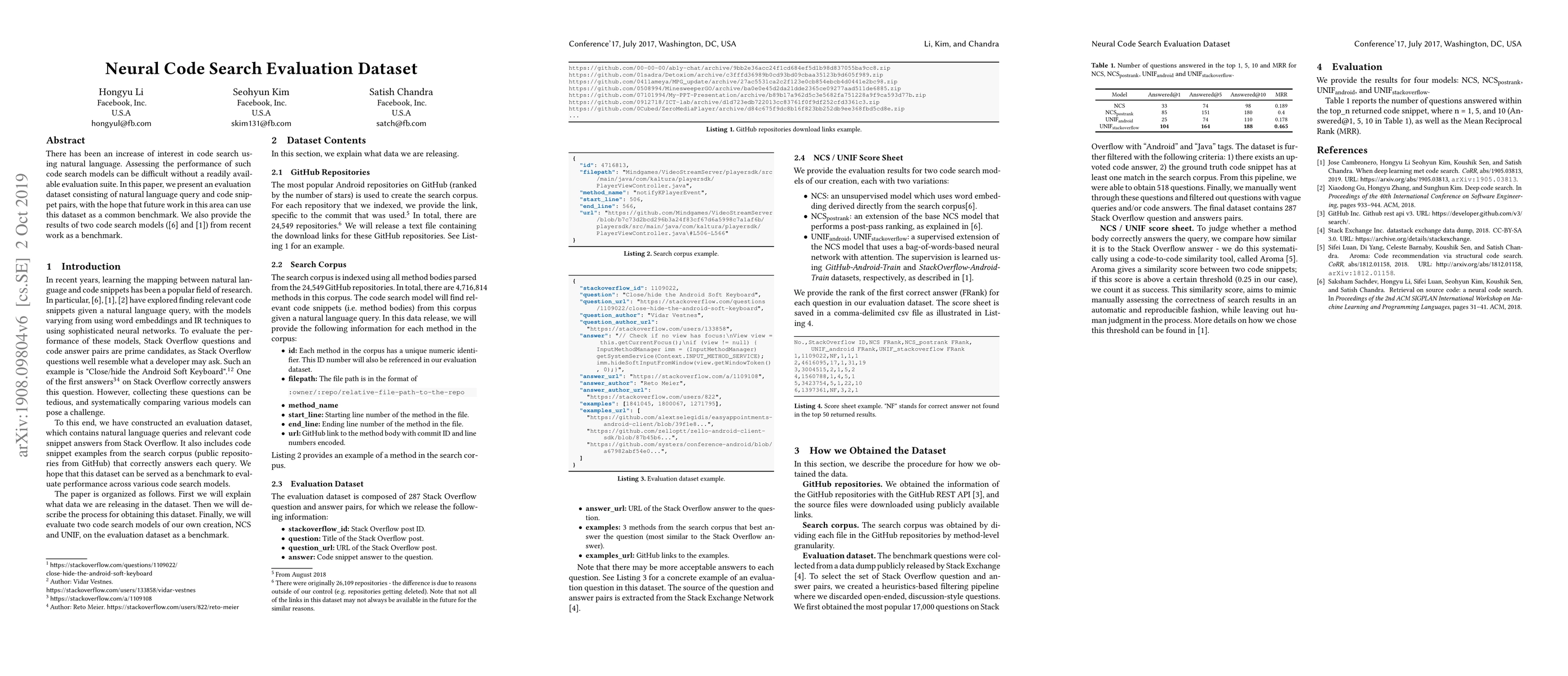 There has been an increase of interest in code search using natural language. Assessing the performance of such code search models can be difficult without a readily available evaluation suite. In this paper, we present an evaluation dataset consisting of natural language query and code snippet pairs, with the hope that future work in this area can use this dataset as a common benchmark. We also provide the results of two code search models ([1] and [6]) from recent work. The evaluation dataset is available at https://github.com/facebookresearch/Neural-Code-Search-Evaluation-Dataset