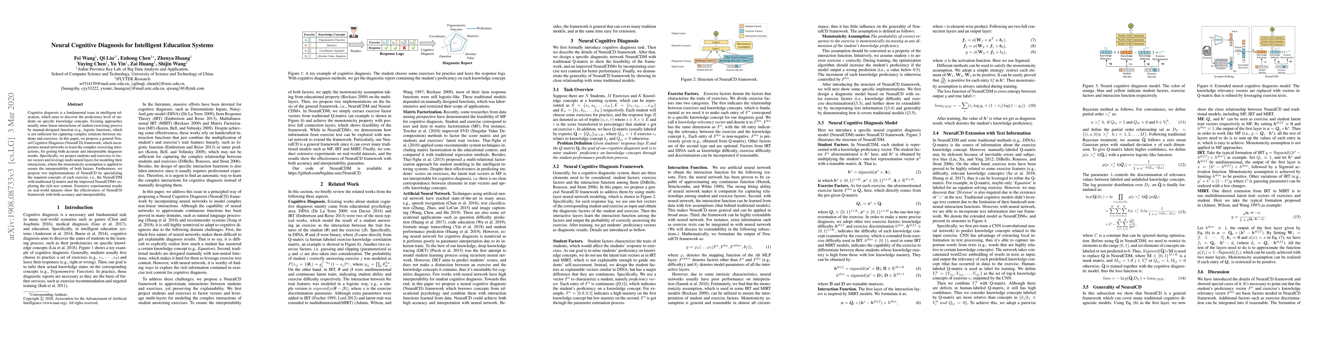 This paper proposes a Neural Cognitive Diagnosis (NeuralCD) framework using neural networks to model complex student-exercise interactions for accurate and interpretable cognitive diagnosis in intelligent education systems. The framework projects students and exercises to factor vectors and utilizes multi-neural layers, ensuring interpretability through monotonicity, and demonstrates effectiveness through real-world dataset experiments.