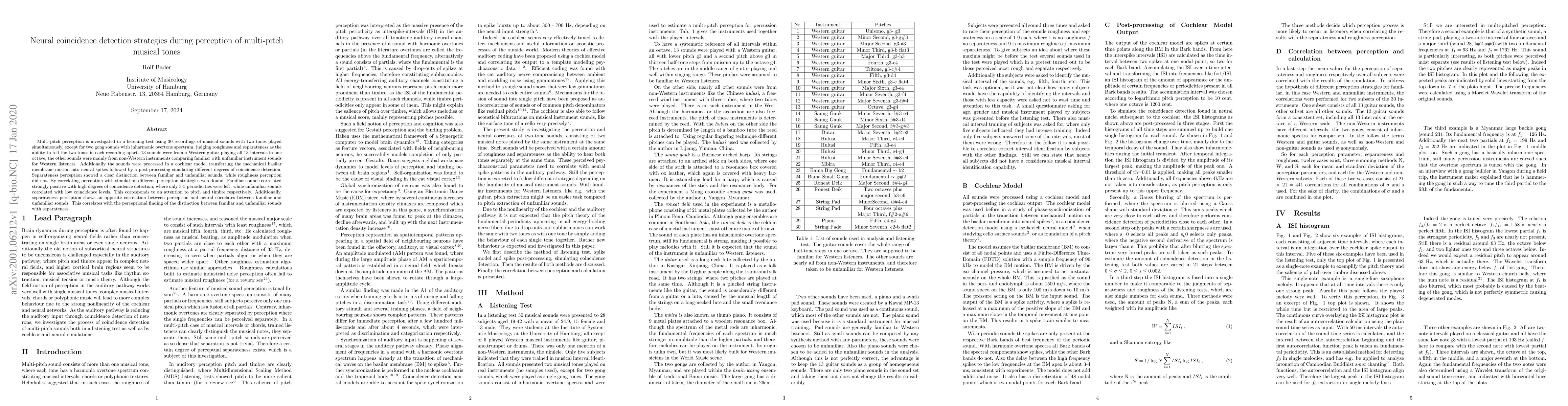 Multi-pitch perception is investigated in a listening test using 30 recordings of musical sounds with two tones played simultaneously, except for two gong sounds with inharmonic overtone spectrum, judging roughness and separateness as the ability to tell the two tones in each recording apart. 13 sounds were from a Western guitar playing all 13 intervals in one octave, the other sounds were mainly from non-Western instruments comparing familiar with unfamiliar instrument sounds for Western listeners. Additionally the sounds were processed in a cochlear model transferring the mechanical basilar membrane motion into neural spikes followed by a post-processing simulating different degrees of coincidence detection. Separateness perception showed a clear distinction between familiar and unfamiliar sounds, while roughness perception did not. By correlating perception with simulation different perception strategies were found. Familiar sounds correlated strongly positive with high degrees of coincidence detection, where only 3-5 periodicities were left, while unfamiliar sounds correlated with low coincidence levels. This corresponds to an attention to pitch and timbre respectively. Additionally, separateness perception shows an opposite correlation between perception and neural correlates between familiar and unfamiliar sounds. This correlates with the perceptional finding of the distinction between familiar and unfamiliar sounds with separateness.