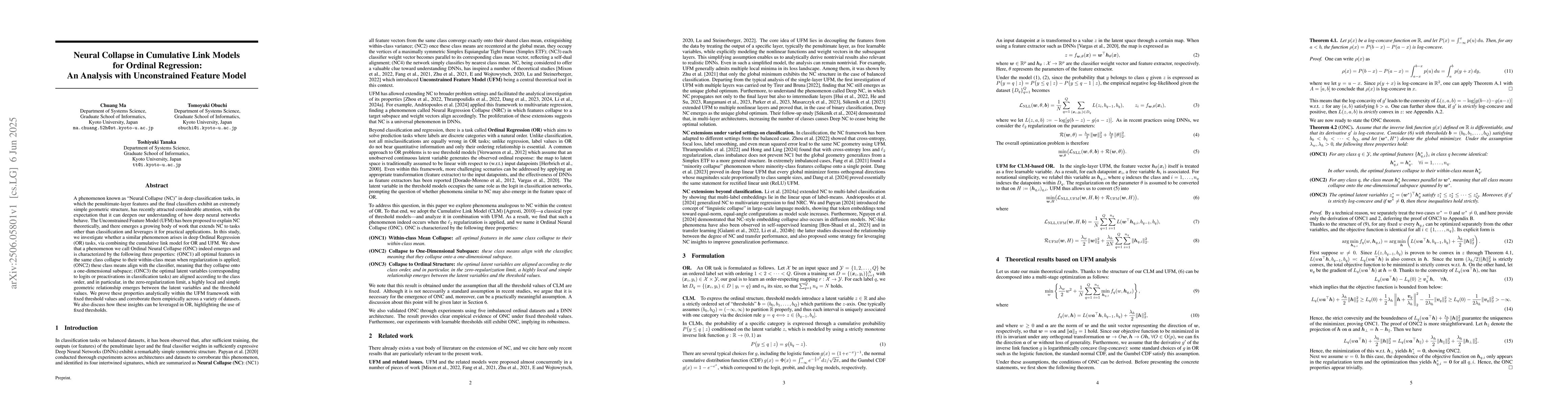 Analytical proofs and empirical validation of Ordinal Neural Collapse (ONC) within the Unconstrained Feature Model (UFM) for Ordinal Regression tasks.