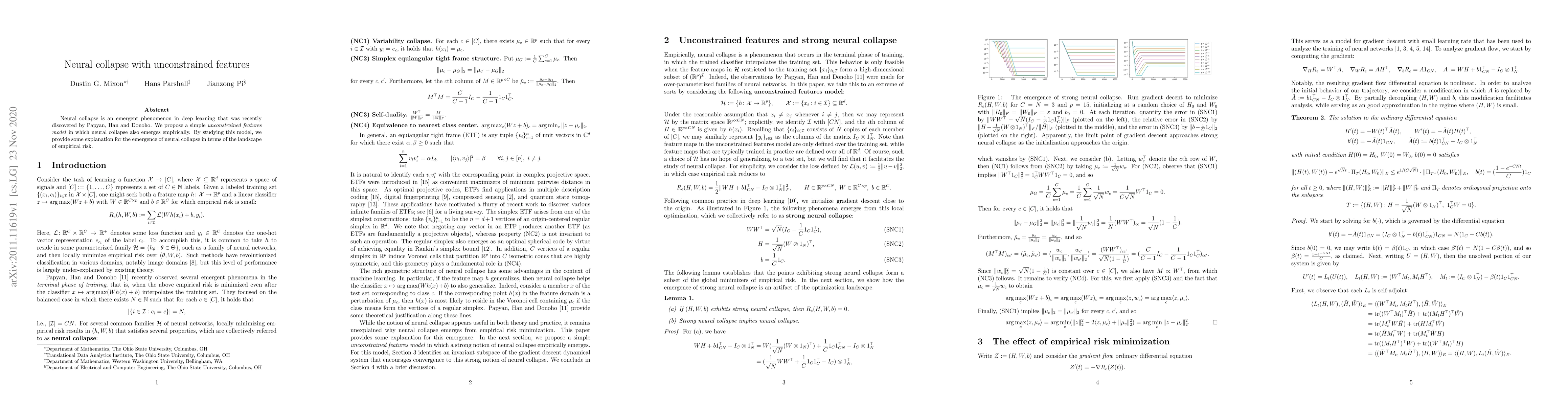 Neural collapse is an emergent phenomenon in deep learning that was recently discovered by Papyan, Han and Donoho. We propose a simple "unconstrained features model" in which neural collapse also emerges empirically. By studying this model, we provide some explanation for the emergence of neural collapse in terms of the landscape of empirical risk.
