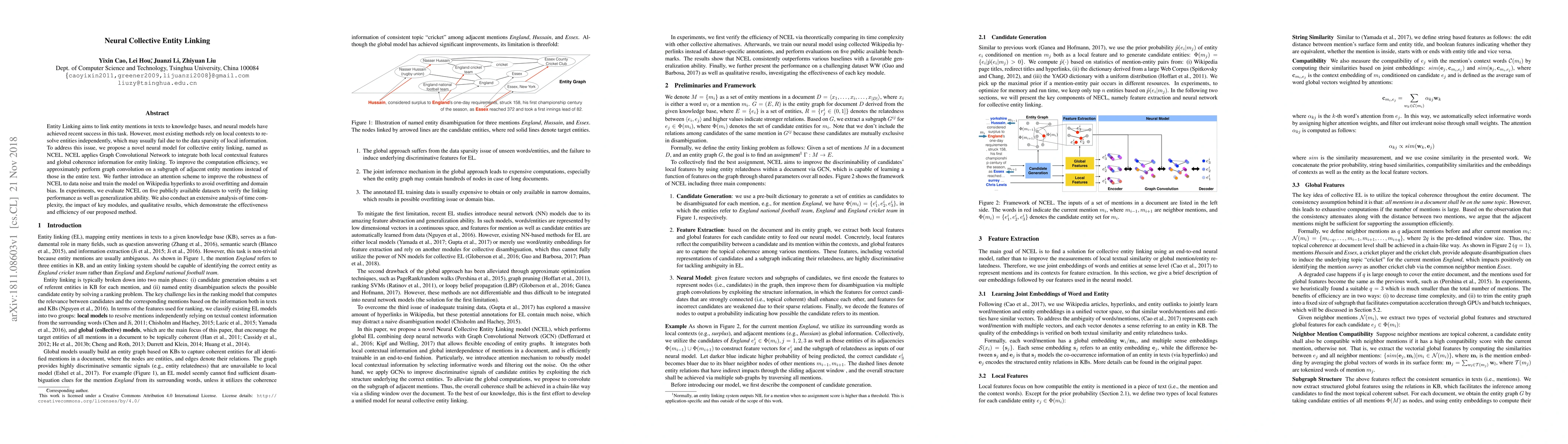 The paper proposes NCEL, a neural model for collective entity linking that uses Graph Convolutional Networks to integrate local and global context, improving performance over local context-based methods. The model demonstrates enhanced efficiency and robustness through subgraph convolution and attention mechanisms, showing effective performance across multiple datasets.