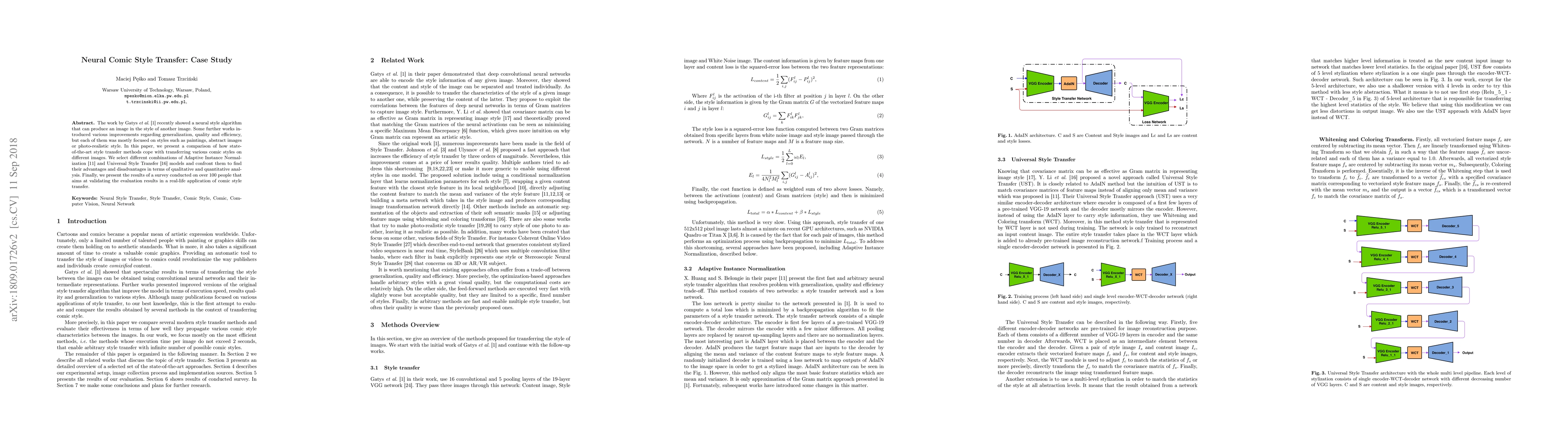 This paper compares state-of-the-art neural style transfer methods for applying comic styles to images, evaluating Adaptive Instance Normalization and Universal Style Transfer through qualitative and quantitative analysis. It concludes with a survey of over 100 people to validate the practical effectiveness of comic style transfer.