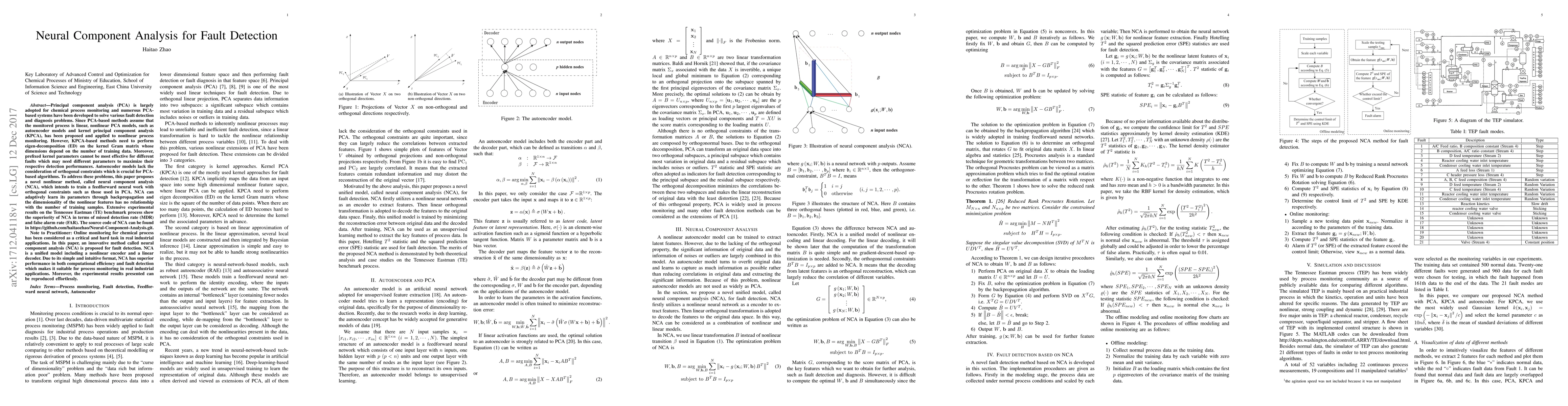 This paper proposes a novel neural component analysis (NCA) method for fault detection in chemical processes, addressing limitations of PCA-based and KPCA-based methods. NCA trains a feedforward neural network with orthogonal constraints, adaptively learning parameters via backpropagation, and demonstrating superior performance in missed detection and false alarm rates on the Tennessee Eastman benchmark process.