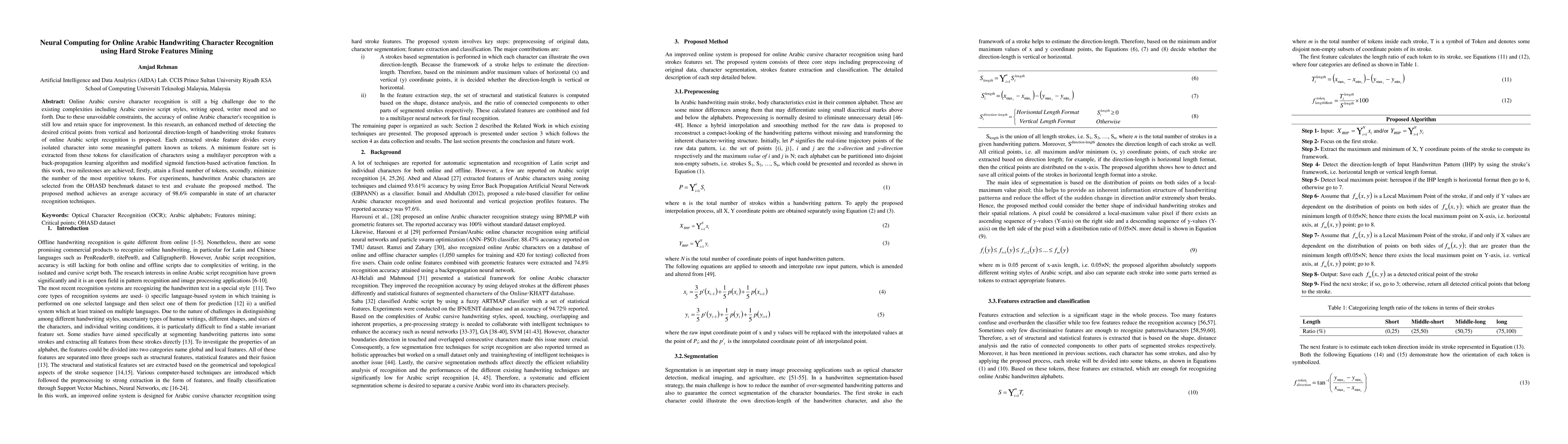 Online Arabic cursive character recognition is still a big challenge due to the existing complexities including Arabic cursive script styles, writing speed, writer mood and so forth. Due to these unavoidable constraints, the accuracy of online Arabic character's recognition is still low and retain space for improvement. In this research, an enhanced method of detecting the desired critical points from vertical and horizontal direction-length of handwriting stroke features of online Arabic script recognition is proposed. Each extracted stroke feature divides every isolated character into some meaningful pattern known as tokens. A minimum feature set is extracted from these tokens for classification of characters using a multilayer perceptron with a back-propagation learning algorithm and modified sigmoid function-based activation function. In this work, two milestones are achieved; firstly, attain a fixed number of tokens, secondly, minimize the number of the most repetitive tokens. For experiments, handwritten Arabic characters are selected from the OHASD benchmark dataset to test and evaluate the proposed method. The proposed method achieves an average accuracy of 98.6% comparable in state of art character recognition techniques.