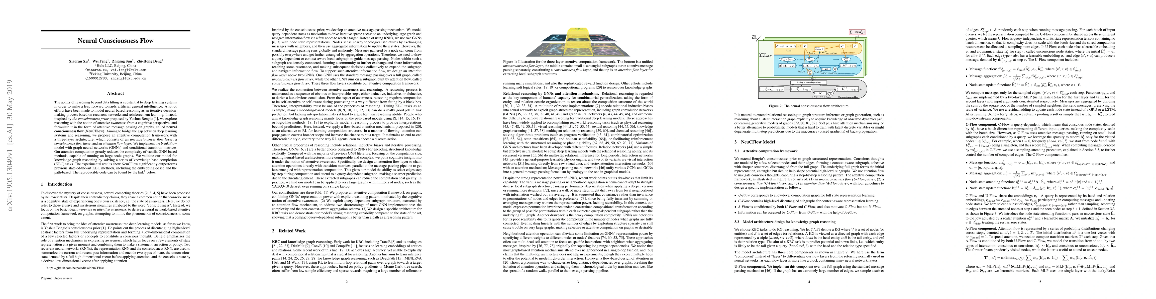 The ability of reasoning beyond data fitting is substantial to deep learning systems in order to make a leap forward towards artificial general intelligence. A lot of efforts have been made to model neural-based reasoning as an iterative decision-making process based on recurrent networks and reinforcement learning. Instead, inspired by the consciousness prior proposed by Yoshua Bengio, we explore reasoning with the notion of attentive awareness from a cognitive perspective, and formulate it in the form of attentive message passing on graphs, called neural consciousness flow (NeuCFlow). Aiming to bridge the gap between deep learning systems and reasoning, we propose an attentive computation framework with a three-layer architecture, which consists of an unconsciousness flow layer, a consciousness flow layer, and an attention flow layer. We implement the NeuCFlow model with graph neural networks (GNNs) and conditional transition matrices. Our attentive computation greatly reduces the complexity of vanilla GNN-based methods, capable of running on large-scale graphs. We validate our model for knowledge graph reasoning by solving a series of knowledge base completion (KBC) tasks. The experimental results show NeuCFlow significantly outperforms previous state-of-the-art KBC methods, including the embedding-based and the path-based. The reproducible code can be found by the link below.