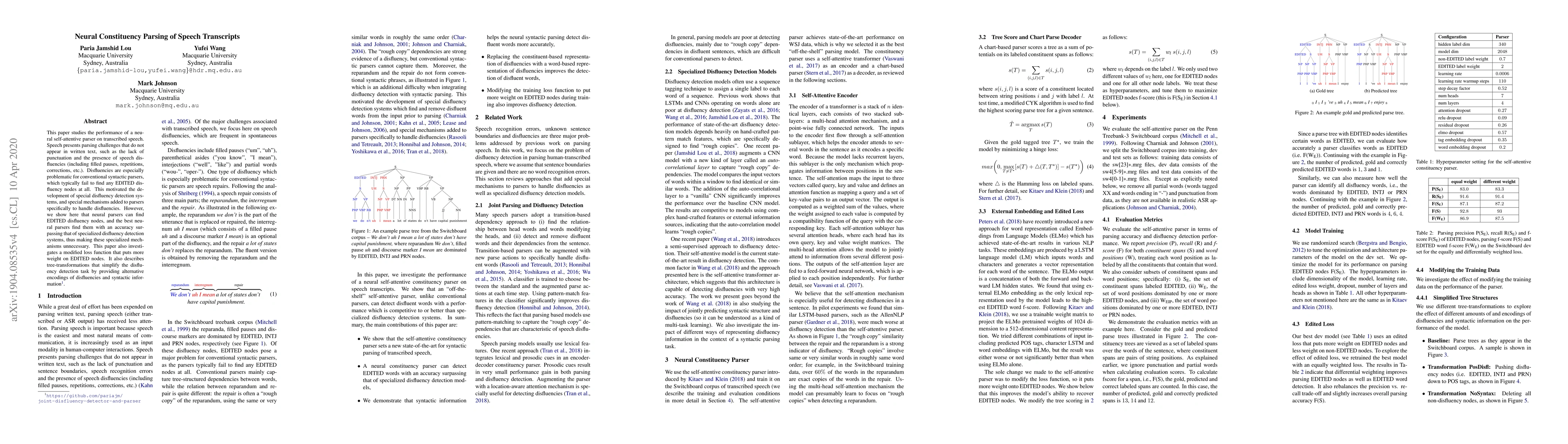 The paper introduces a neural self-attentive parser that effectively handles speech disfluencies, along with a modified loss function and tree transformations for improved performance.