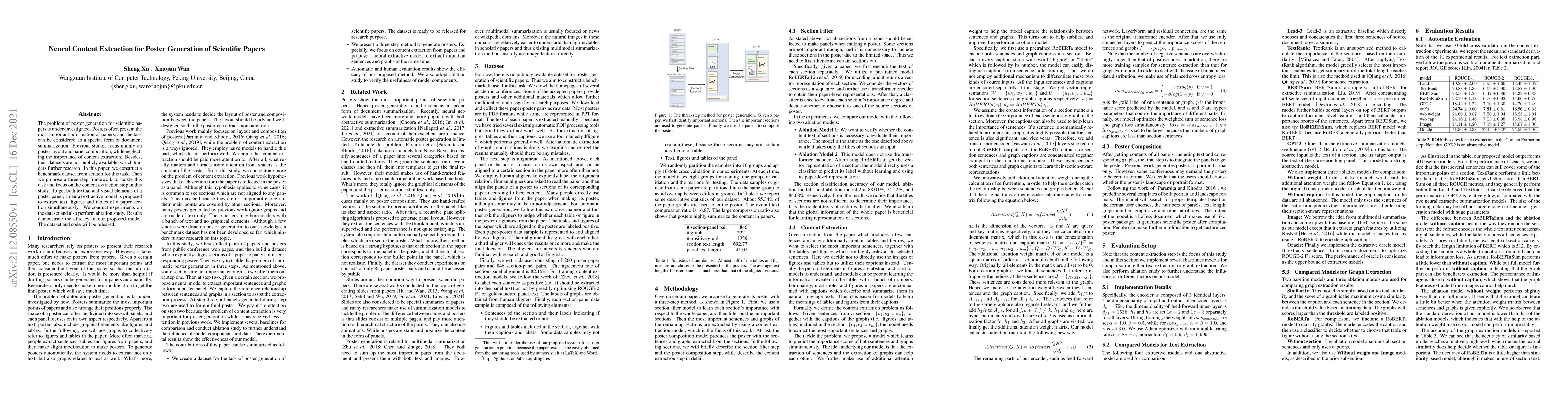 This paper addresses the under-researched problem of scientific paper poster generation by constructing a new benchmark dataset. It proposes a three-step framework focusing on neural content extraction to simultaneously extract text, figures, and tables, demonstrating the model's effectiveness through experiments and ablation studies.