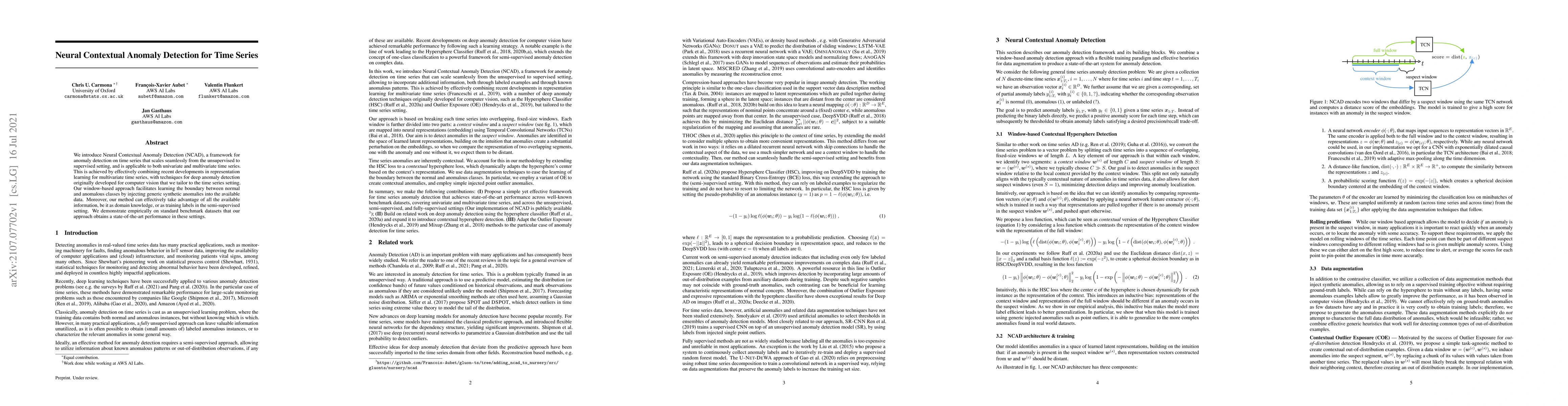 We introduce Neural Contextual Anomaly Detection (NCAD), a framework for anomaly detection on time series that scales seamlessly from the unsupervised to supervised setting, and is applicable to both univariate and multivariate time series. This is achieved by effectively combining recent developments in representation learning for multivariate time series, with techniques for deep anomaly detection originally developed for computer vision that we tailor to the time series setting. Our window-based approach facilitates learning the boundary between normal and anomalous classes by injecting generic synthetic anomalies into the available data. Moreover, our method can effectively take advantage of all the available information, be it as domain knowledge, or as training labels in the semi-supervised setting. We demonstrate empirically on standard benchmark datasets that our approach obtains a state-of-the-art performance in these settings.