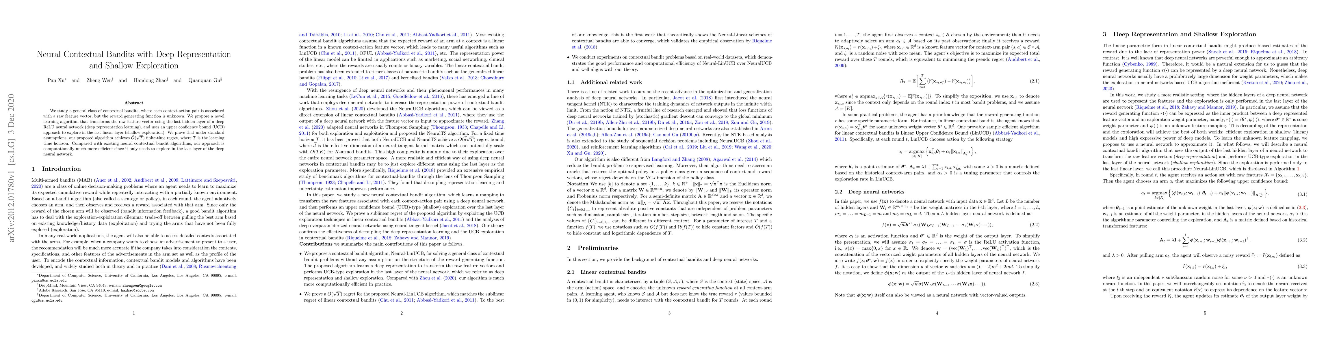 This paper proposes a novel neural contextual bandit algorithm that uses deep representation learning to transform raw feature vectors and shallow exploration via an upper confidence bound approach. The algorithm achieves $\tilde{O}(\sqrt{T})$ finite-time regret and is computationally efficient by only exploring in the last layer of the neural network.