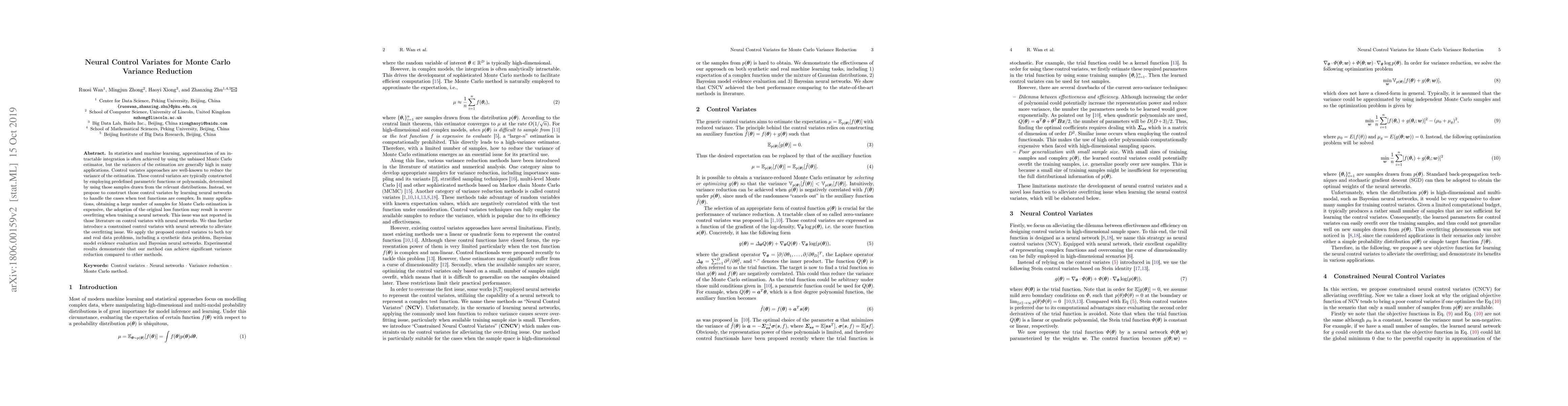 This paper proposes using neural control variates, constructed via learned neural networks, to reduce variance in Monte Carlo estimation. To address the issue of limited samples, it introduces auxiliary random variables to augment training data, demonstrating significant variance reduction in applications like thermodynamic integration and reinforcement learning.