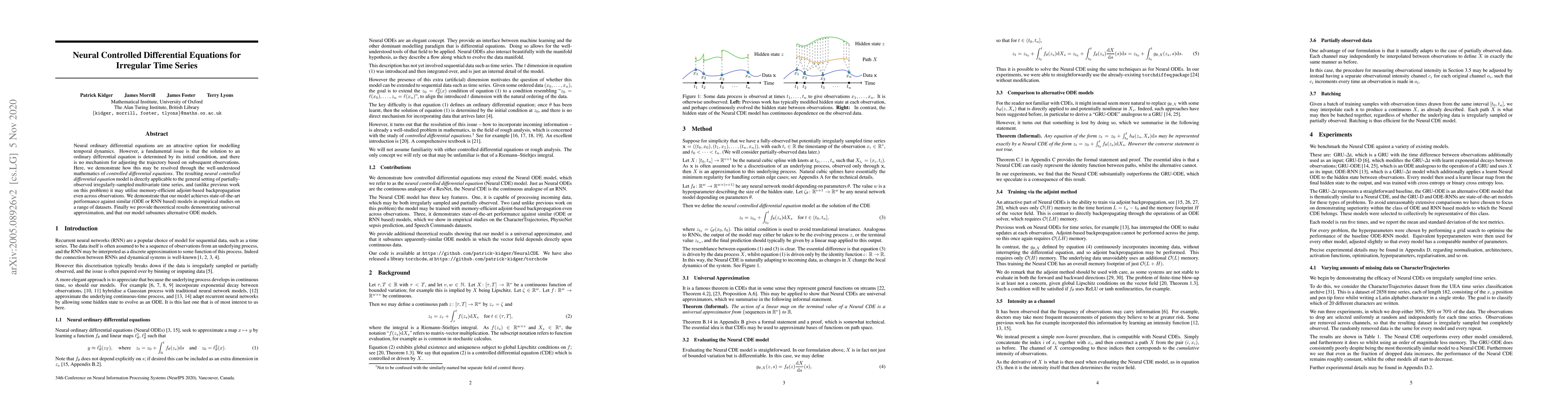Neural ordinary differential equations are an attractive option for modelling temporal dynamics. However, a fundamental issue is that the solution to an ordinary differential equation is determined by its initial condition, and there is no mechanism for adjusting the trajectory based on subsequent observations. Here, we demonstrate how this may be resolved through the well-understood mathematics of \emph{controlled differential equations}. The resulting \emph{neural controlled differential equation} model is directly applicable to the general setting of partially-observed irregularly-sampled multivariate time series, and (unlike previous work on this problem) it may utilise memory-efficient adjoint-based backpropagation even across observations. We demonstrate that our model achieves state-of-the-art performance against similar (ODE or RNN based) models in empirical studies on a range of datasets. Finally we provide theoretical results demonstrating universal approximation, and that our model subsumes alternative ODE models.