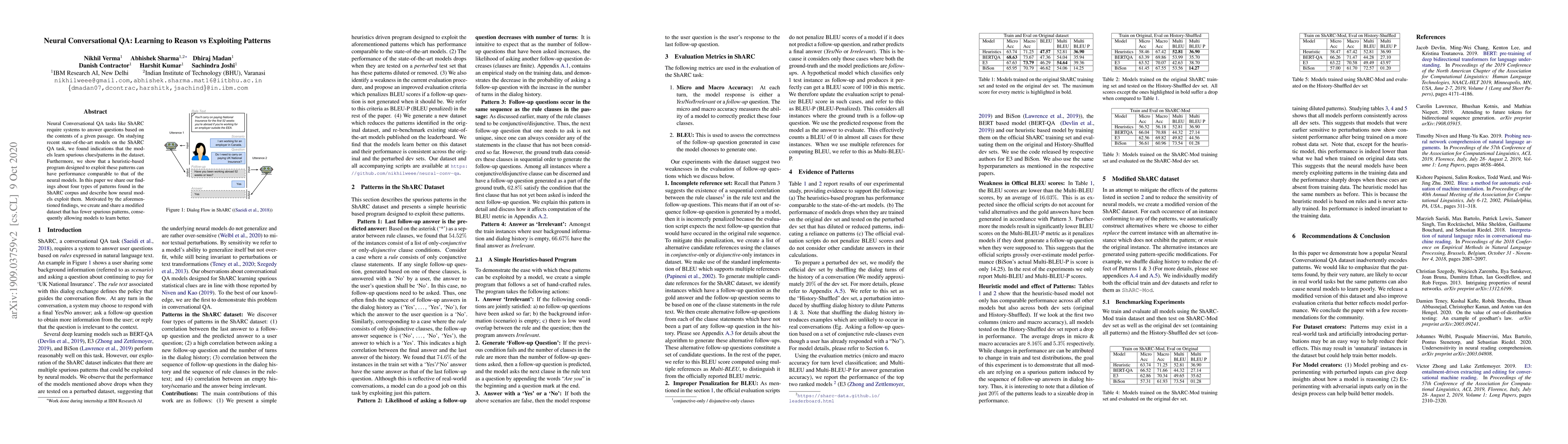 This paper investigates how neural models for conversational QA tasks like ShARCQA exploit dataset patterns instead of true reasoning, demonstrating that heuristic-based approaches can match neural performance. It proposes a modified dataset to reduce spurious patterns, aiming to improve model learning.