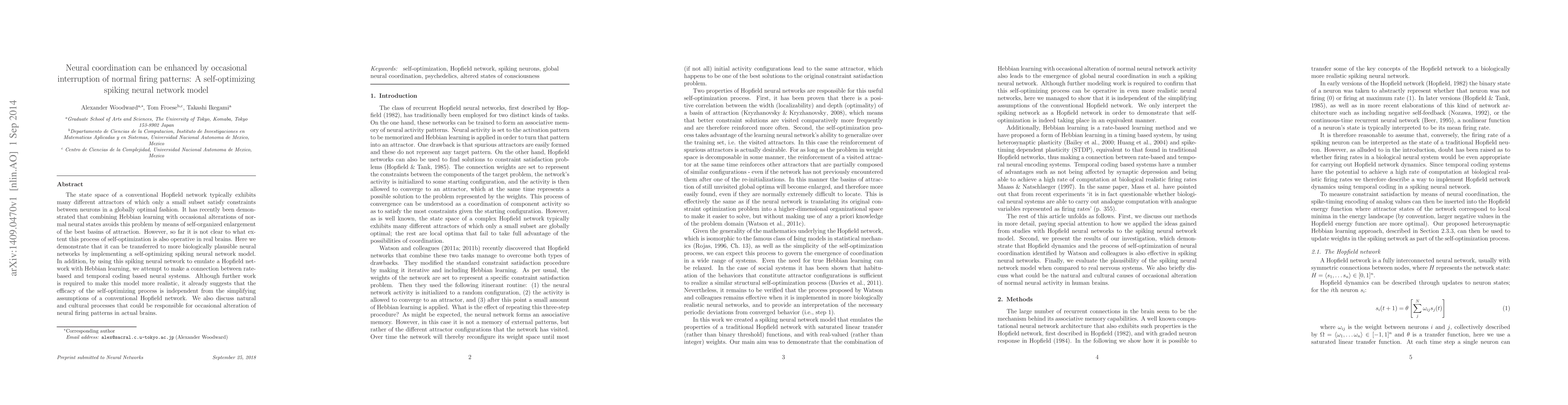 The state space of a conventional Hopfield network typically exhibits many different attractors of which only a small subset satisfy constraints between neurons in a globally optimal fashion. It has recently been demonstrated that combining Hebbian learning with occasional alterations of normal neural states avoids this problem by means of self-organized enlargement of the best basins of attraction. However, so far it is not clear to what extent this process of self-optimization is also operative in real brains. Here we demonstrate that it can be transferred to more biologically plausible neural networks by implementing a self-optimizing spiking neural network model. In addition, by using this spiking neural network to emulate a Hopfield network with Hebbian learning, we attempt to make a connection between rate-based and temporal coding based neural systems. Although further work is required to make this model more realistic, it already suggests that the efficacy of the self-optimizing process is independent from the simplifying assumptions of a conventional Hopfield network. We also discuss natural and cultural processes that could be responsible for occasional alteration of neural firing patterns in actual brains