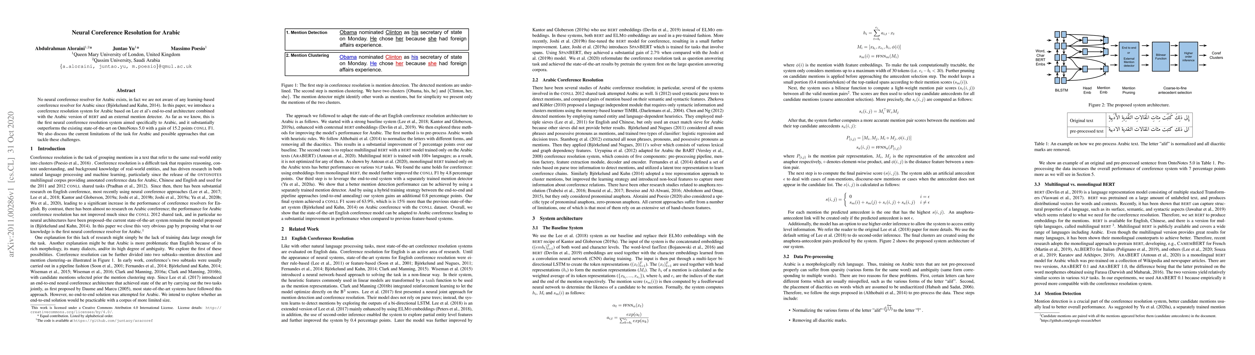 This paper presents the first neural coreference resolution system for Arabic, combining Lee et al's architecture with an Arabic BERT and mention detector, significantly improving performance over existing methods on the OntoNotes 5.0 dataset. The authors also discuss limitations and potential future improvements for Arabic coreference resolution.