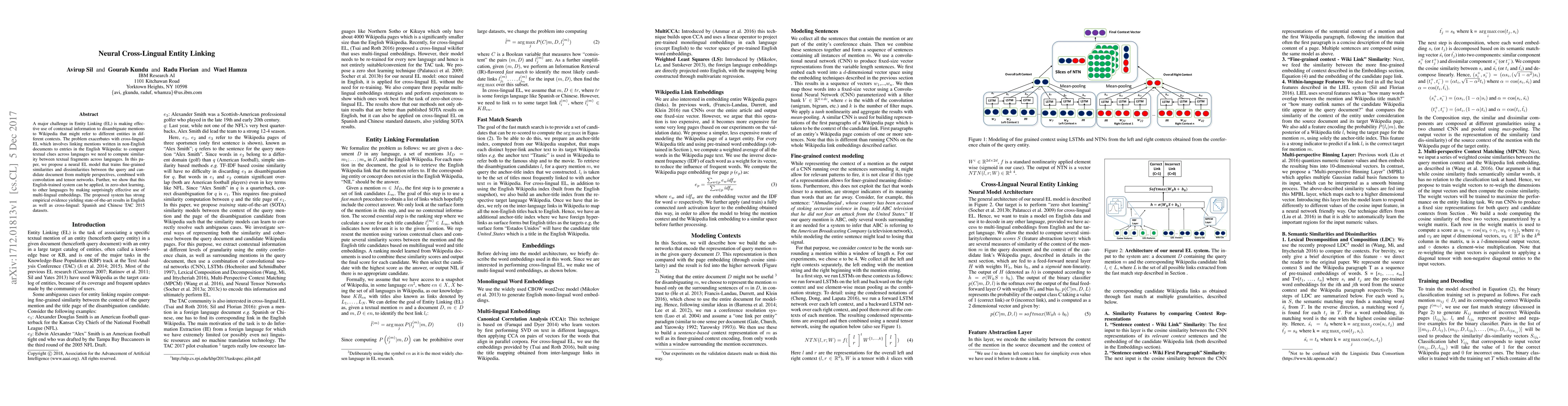 A major challenge in Entity Linking (EL) is making effective use of contextual information to disambiguate mentions to Wikipedia that might refer to different entities in different contexts. The problem exacerbates with cross-lingual EL which involves linking mentions written in non-English documents to entries in the English Wikipedia: to compare textual clues across languages we need to compute similarity between textual fragments across languages. In this paper, we propose a neural EL model that trains fine-grained similarities and dissimilarities between the query and candidate document from multiple perspectives, combined with convolution and tensor networks. Further, we show that this English-trained system can be applied, in zero-shot learning, to other languages by making surprisingly effective use of multi-lingual embeddings. The proposed system has strong empirical evidence yielding state-of-the-art results in English as well as cross-lingual: Spanish and Chinese TAC 2015 datasets.
