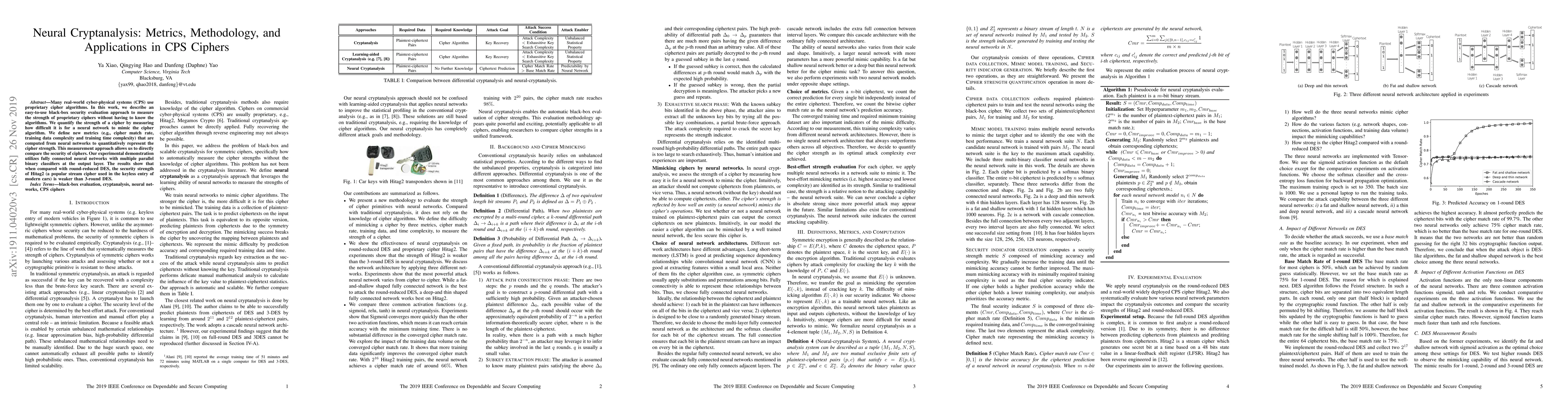 This paper proposes a neural cryptanalysis method to evaluate the security of proprietary ciphers in cyber-physical systems without needing to know their algorithms. It introduces new metrics to quantify cipher strength based on neural network performance, demonstrating that Hitag2 is less secure than 3-round DES.